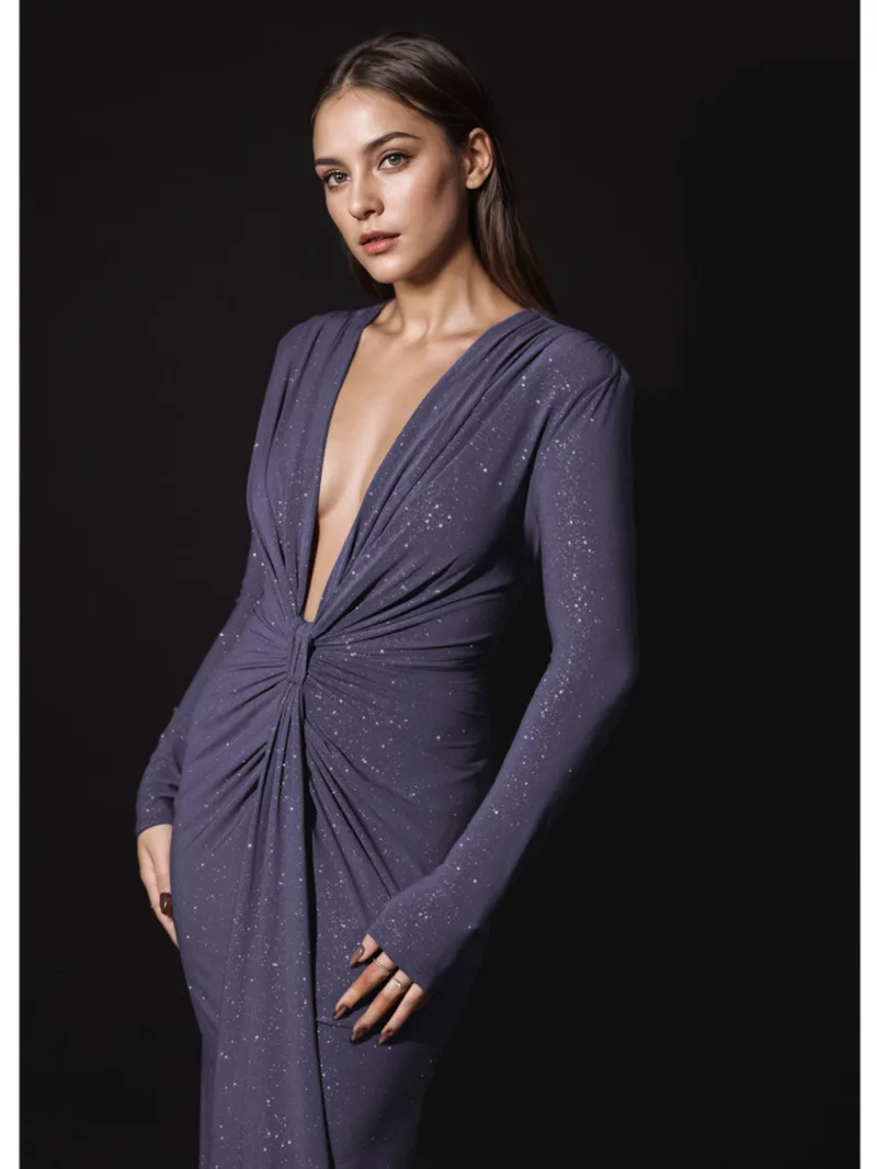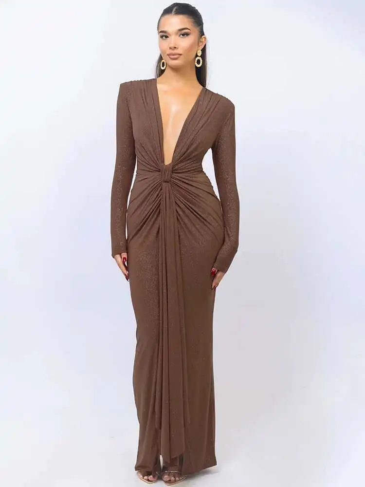 Robe Maxi à paillettes pour femmes, décolleté en V profond, élégante, manches longues, froncée, moulante, fendue, robe de soirée en boîte de nuit, LA7Q