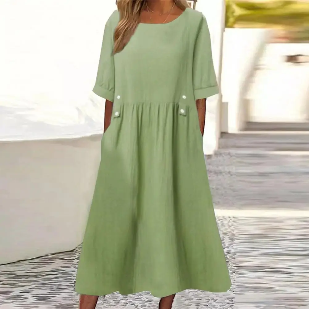 Robe mi-longue élégante pour femmes, coupe ample, avec poches, décor de boutons, ligne a, Silhouette, encolure O, manches courtes, couleur unie |