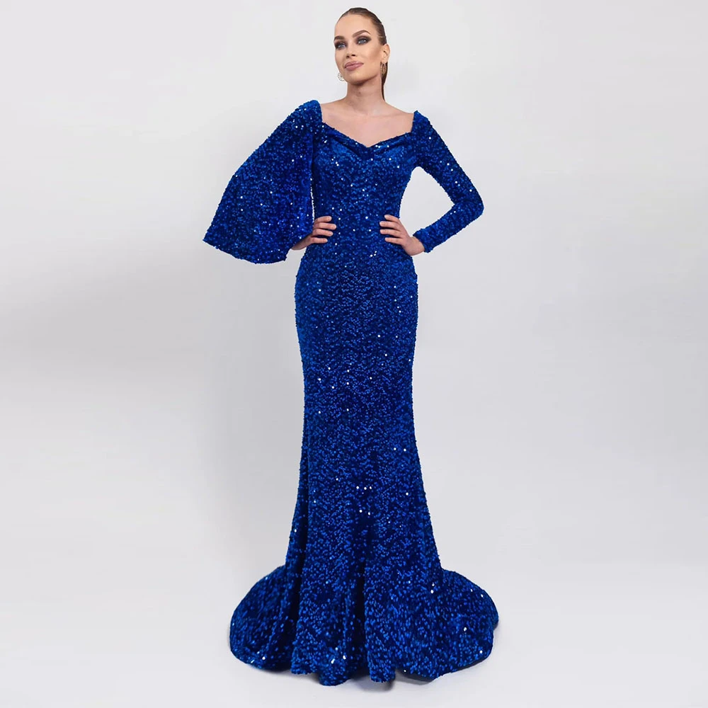 Robe saoudienne à paillettes bleues personnalisées, style sirène, manches longues, longueur au sol, col en V, robe de soirée de mariage formelle