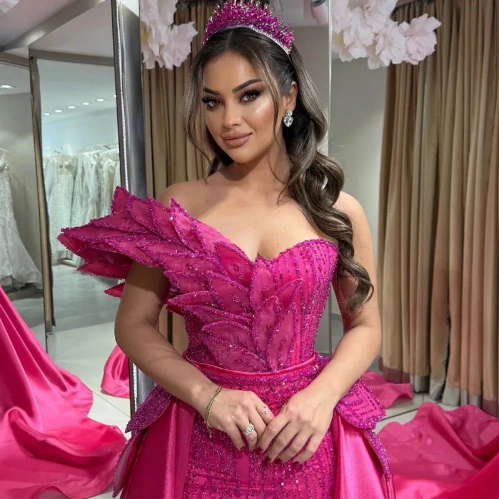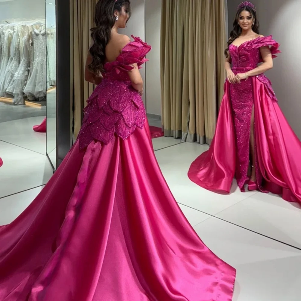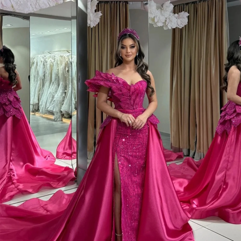 Robes de soirée de luxe pour femmes arabe dubaï personnalisé épaules dénudées cristal paillettes une ligne longue Fuchsia robe de soirée de fiançailles