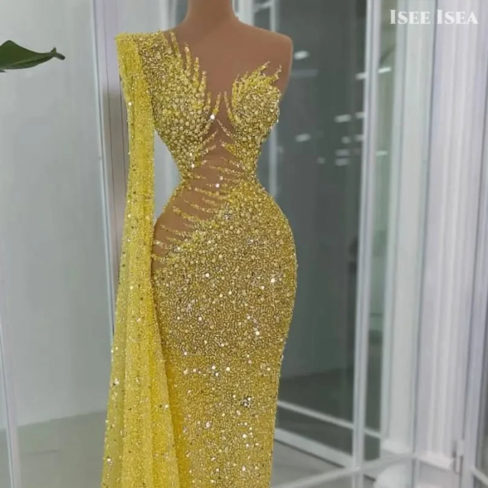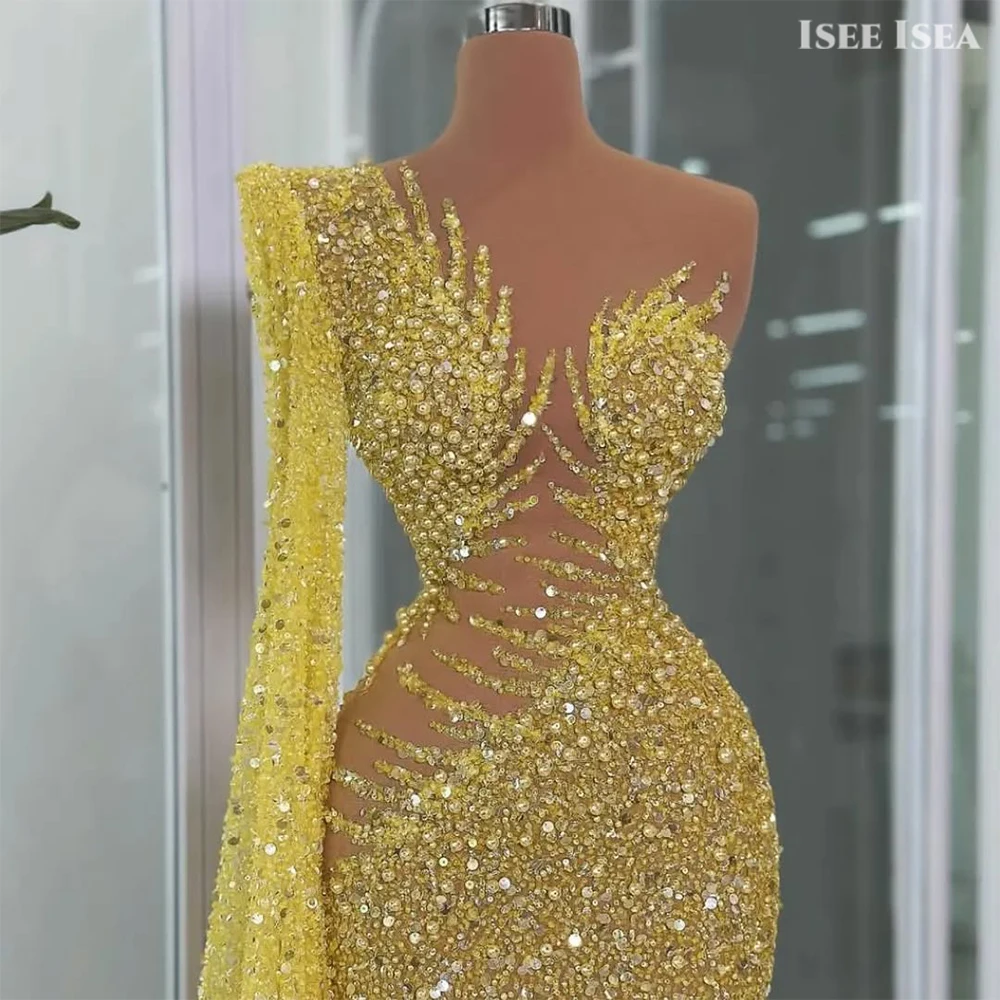 Robes de soirée dorées Dubaï Paillettes Perles Élégant Une épaule illusion taille asabiṁRobe de gala de bal personnalisée