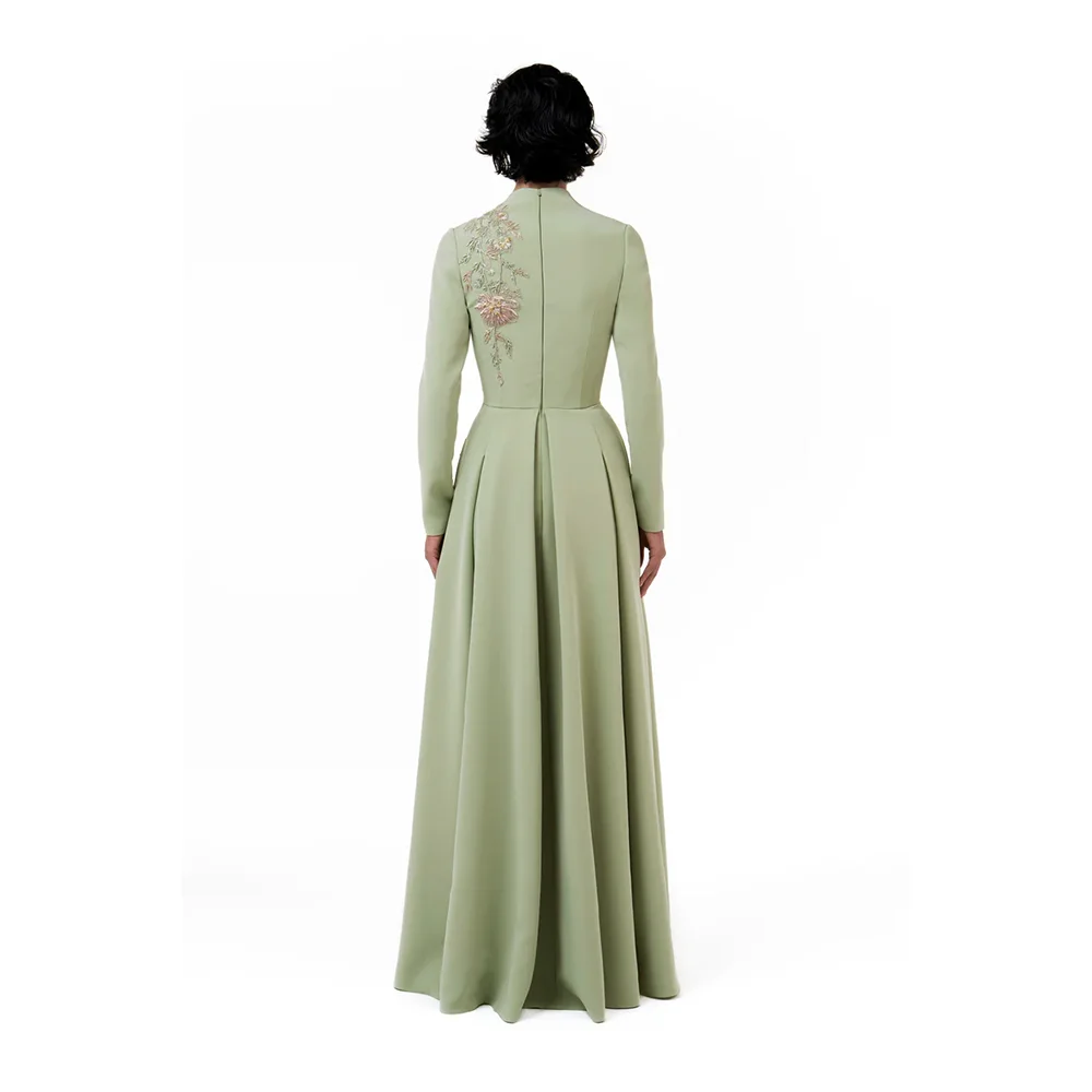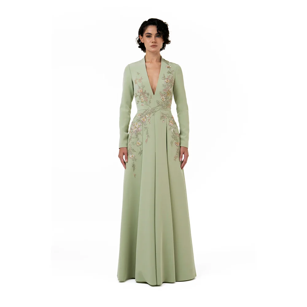 Robes de soirée élégantes, col en v, manches longues, perles, fleurs, ligne a, longueur au sol, robes de bal personnalisées |