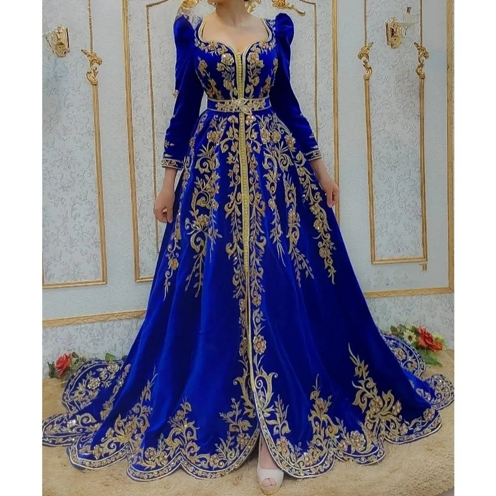 Robes de soirée musulmanes caftan marocain bleu, manches longues, appliques, Dubaï, arabe, Turquie, Caftan Abaya, robe islamique personnalisée |