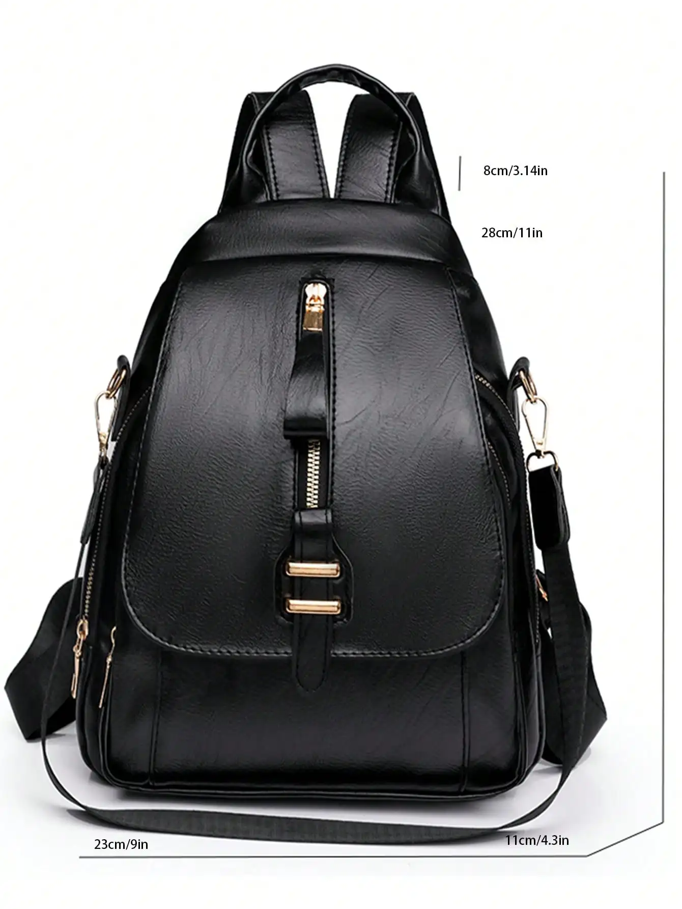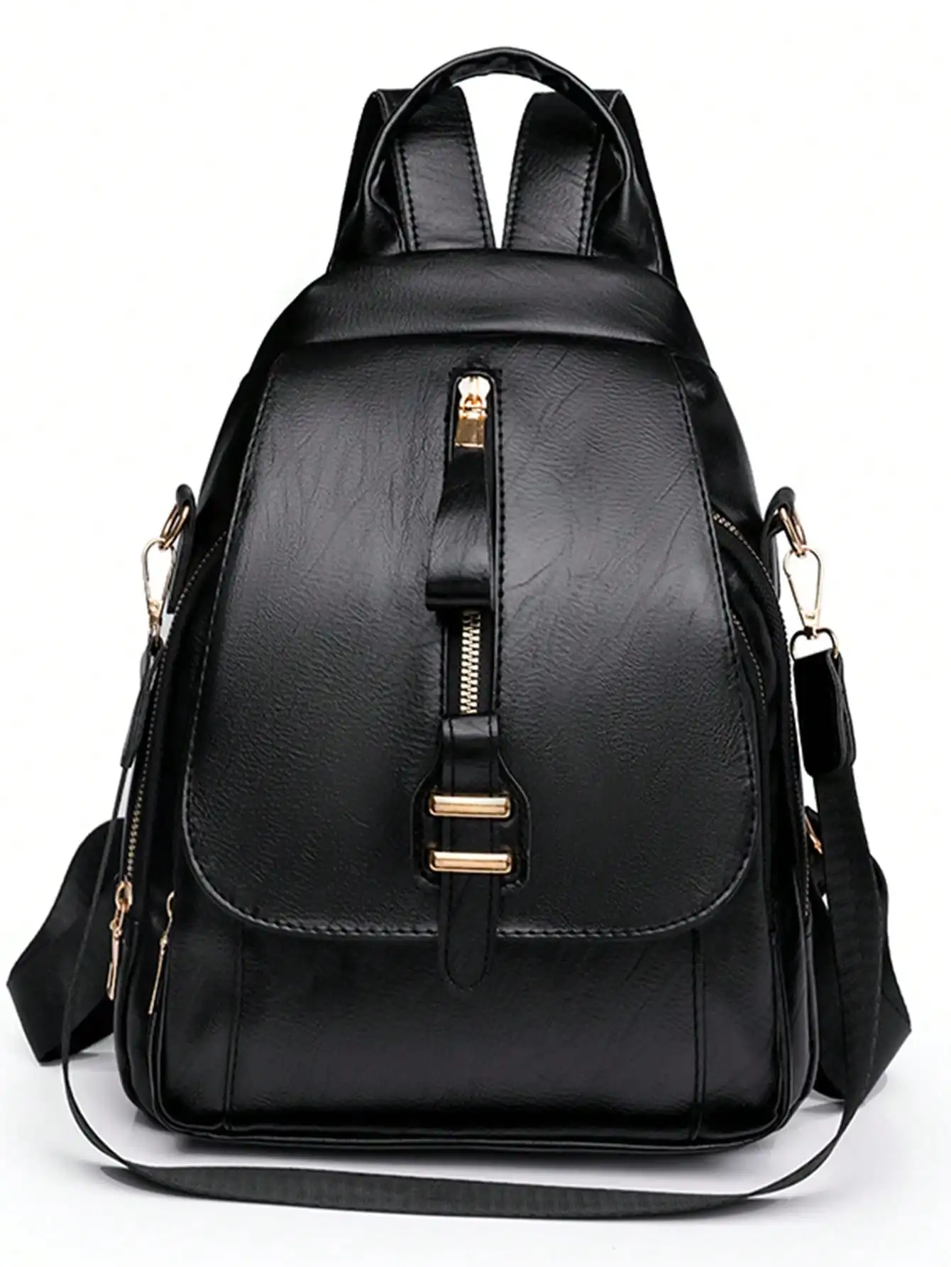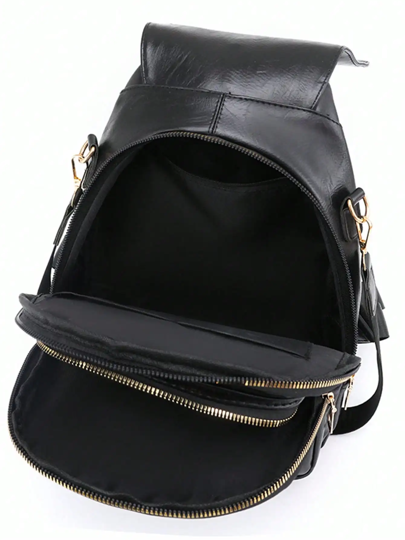 Sac à bandoulière chic avec rabat avant à fermeture éclair, simili cuir noir, décorations métalliques, poche double couche, poches latérales pour les voyageurs |