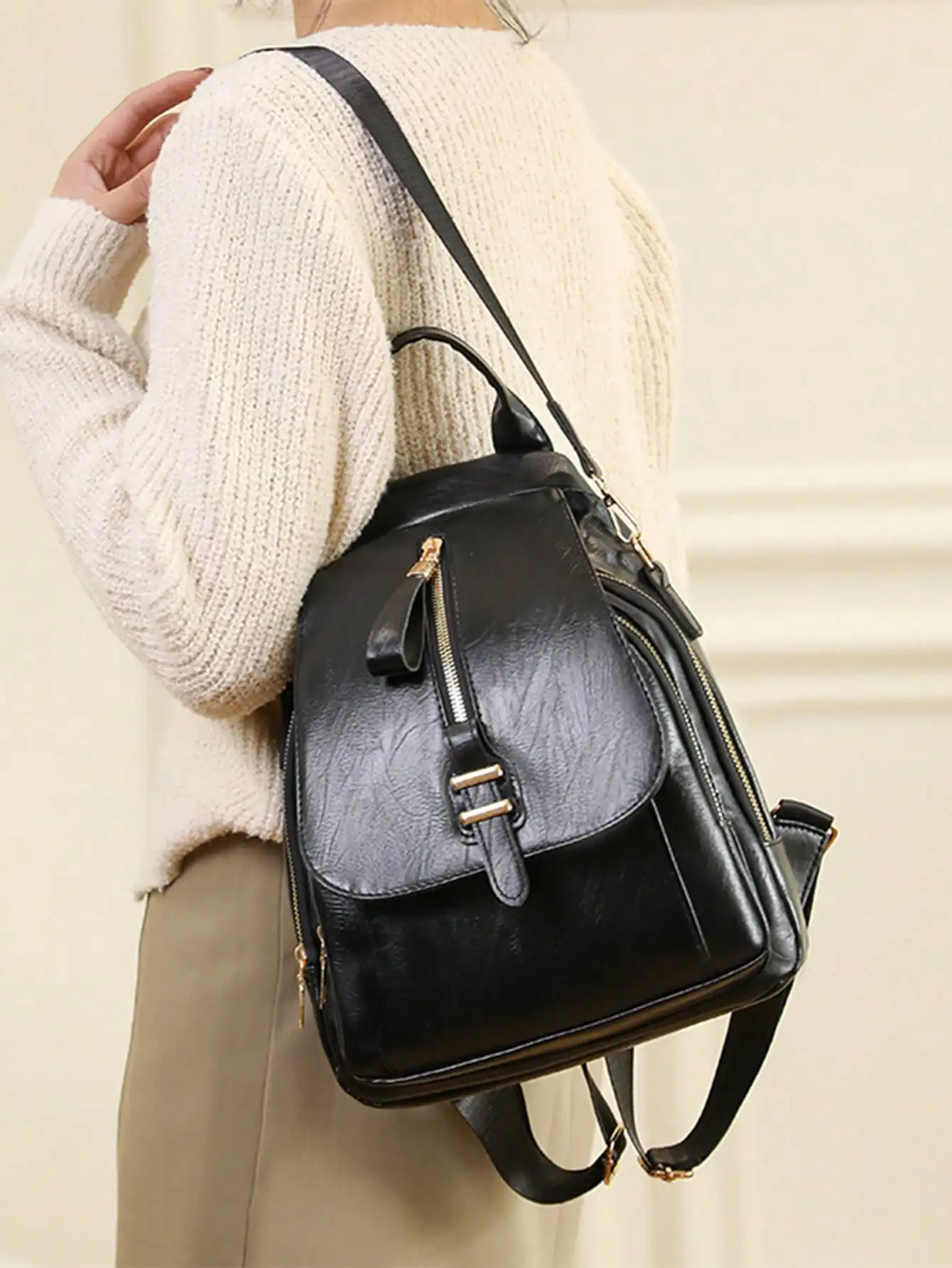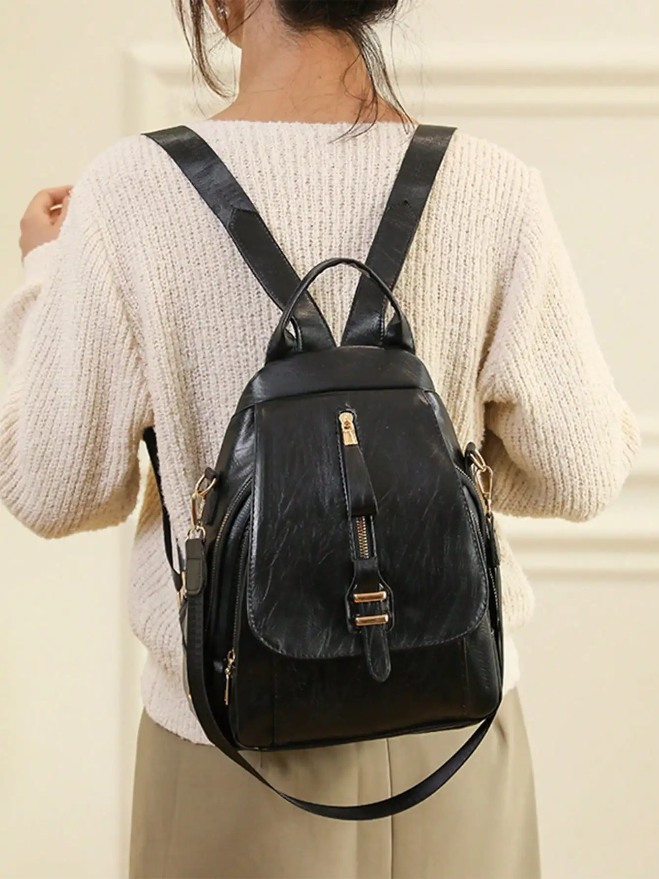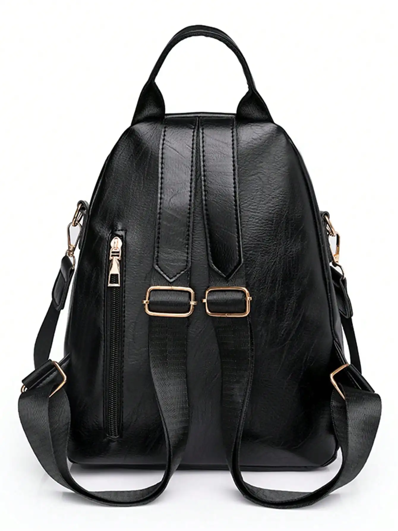 Sac à bandoulière chic avec rabat avant à fermeture éclair, simili cuir noir, décorations métalliques, poche double couche, poches latérales pour les voyageurs |