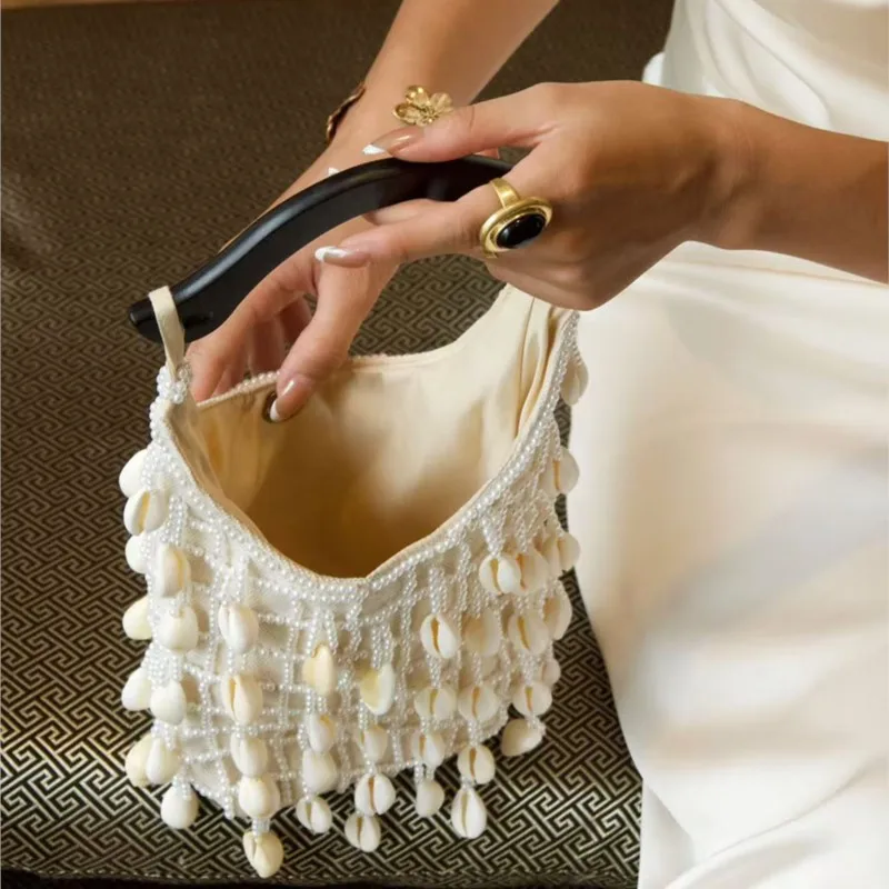 "Ce sac à main en coquillage est vraiment magnifique ! La confection artisanale lui confère une texture unique et une finition de très haute qualité. J'adore le design original avec le pompon brodé et la poignée en bois qui apporte une touche naturelle. Bien qu'il soit un peu plus lourd qu'un sac classique, sa forme élégante et son look tendance en font un accessoire parfait pour sortir le soir. Je suis ravie de mon achat !"