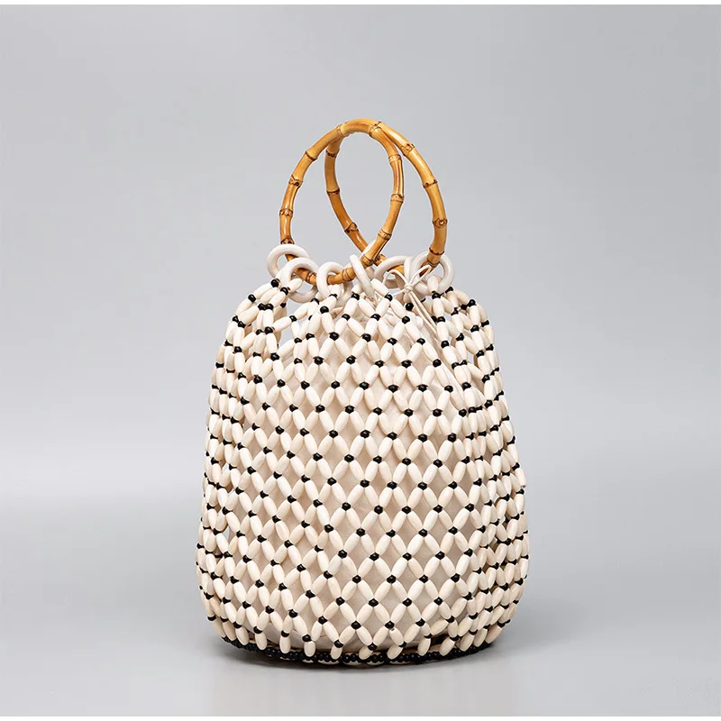 Sac à main tissé en perles de bois fait à la main, sac seau creux Vintage à Double poignée en bambou d'été, pochette de transport de grande capacité pour femmes |