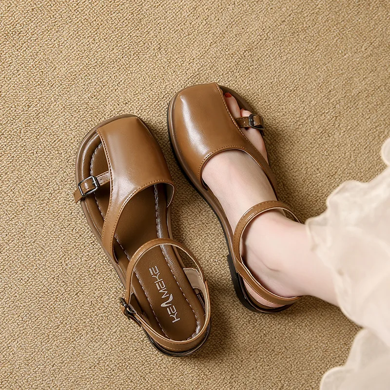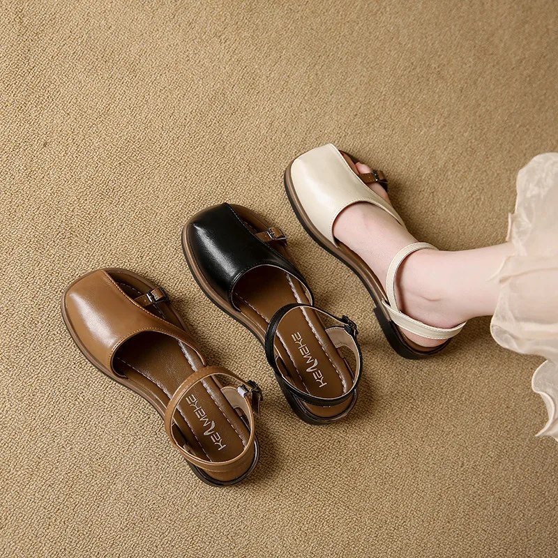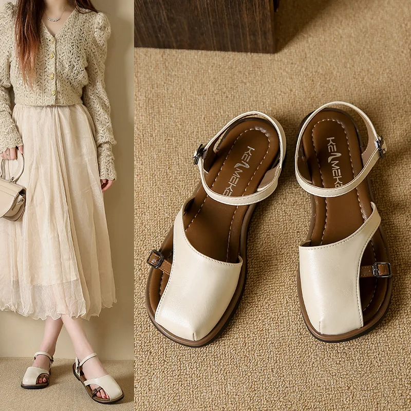 Sandales à talons beiges avec sangle à boucle, chaussures confortables pour femmes, été 2021, noir, plat, clair, bas, mode, nouvelles filles fermées, Fretwork Cas
