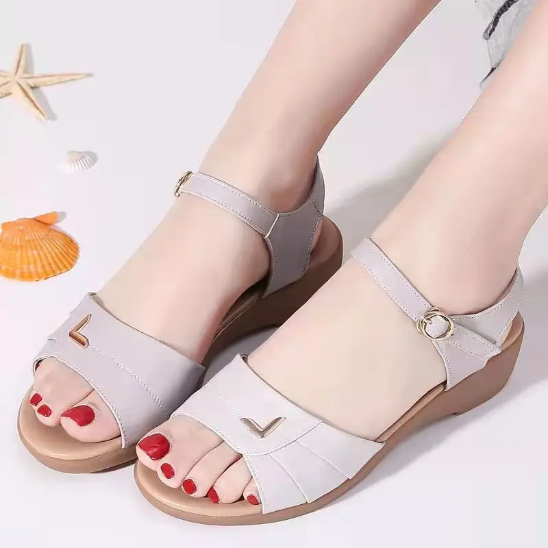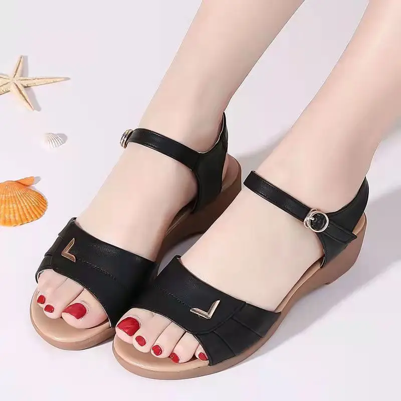 Sandales à Talons Compensés en Cuir pour Femme, Chaussures de Style Romain, Confortables et Élégantes, Bon Marché, Chic, Français, Sabot Noir |