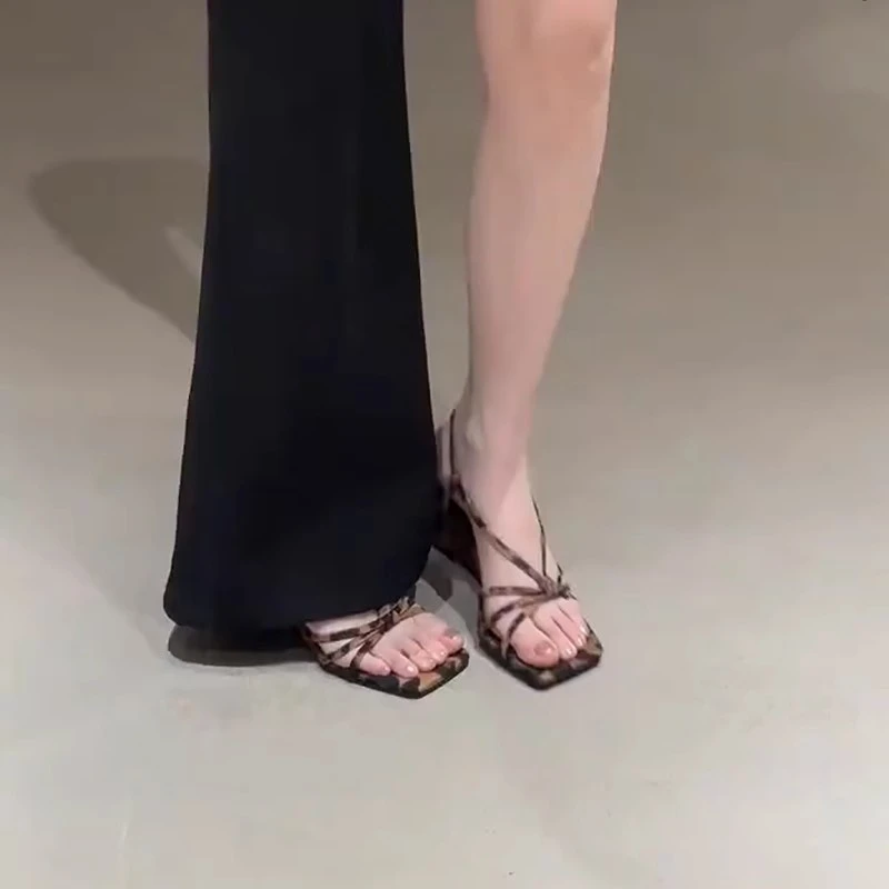 Sandales à talons compensés léopard, nouvelle collection d’été, tête carrée, ceinture fine croisée avec boucle trapèze, talons hauts antidérapants et résistants à l’usure