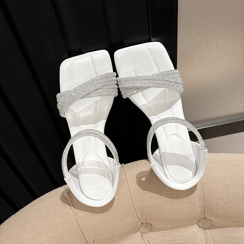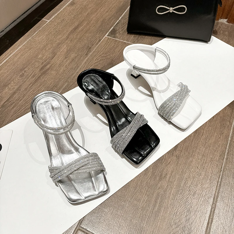 Sandales à talons hauts exquises avec strass pour décorer les couleurs noir et blanc et argent, à la mode et polyvalentes, super accrocheuses