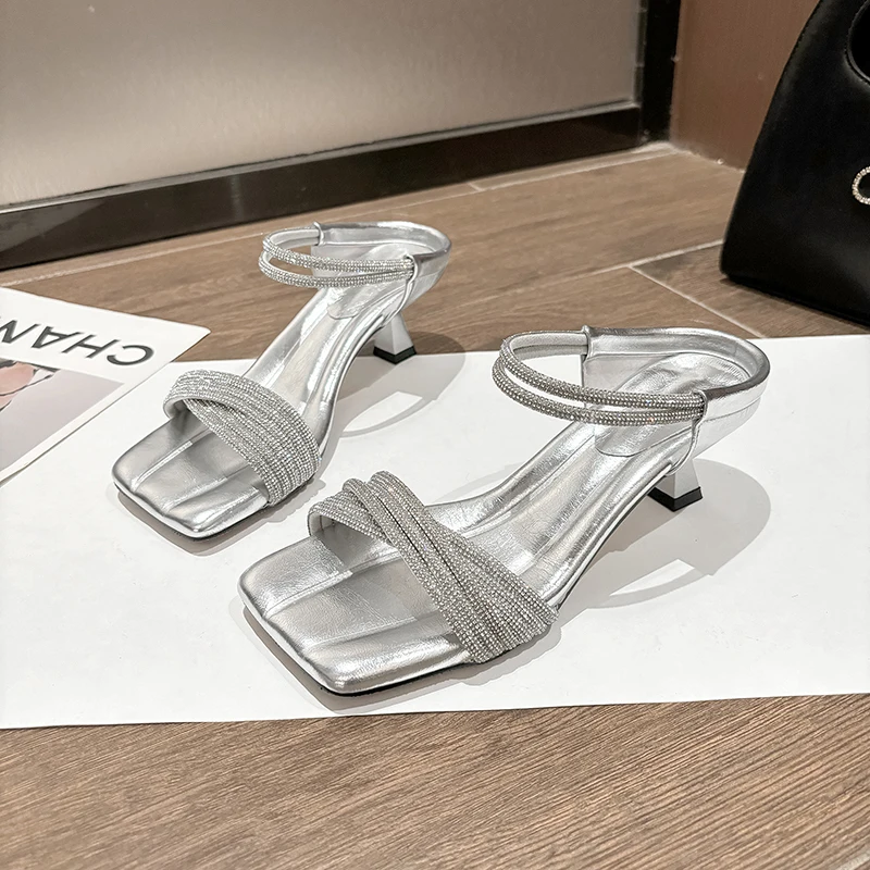 Sandales à talons hauts exquises avec strass pour décorer les couleurs noir et blanc et argent, à la mode et polyvalentes, super accrocheuses |