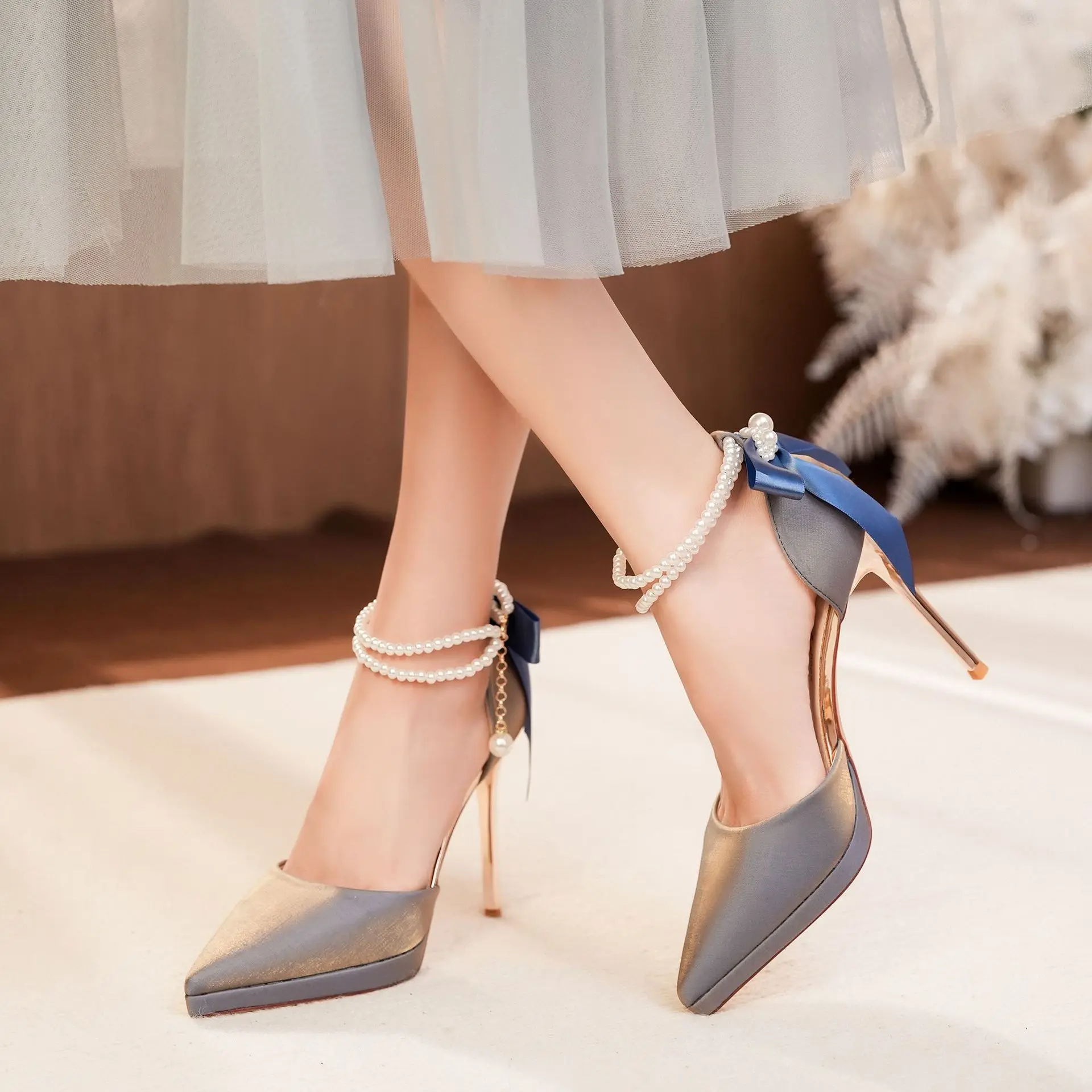 Sandales creuses élégantes pour femmes, talons aiguilles à plateforme, avec nœud en perles, bride à la cheville détachable, talons de travail habillés, 2025 |