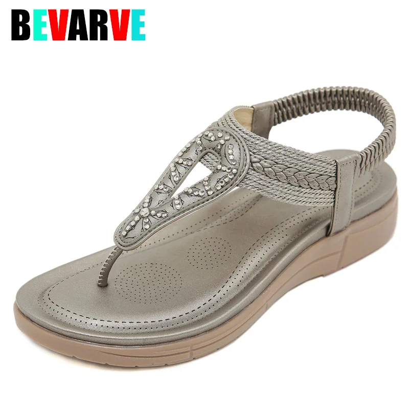 Sandales creuses pour femmes strass perlé bout rond tongs à fond plat été bohème confortable Clip orteil sandales |