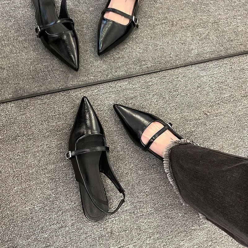 Sandales plates françaises noires Baotou, chaussures de printemps et d’été, diamant pointu, chaussures simples de tempérament, 2025 nouveau