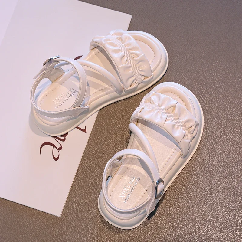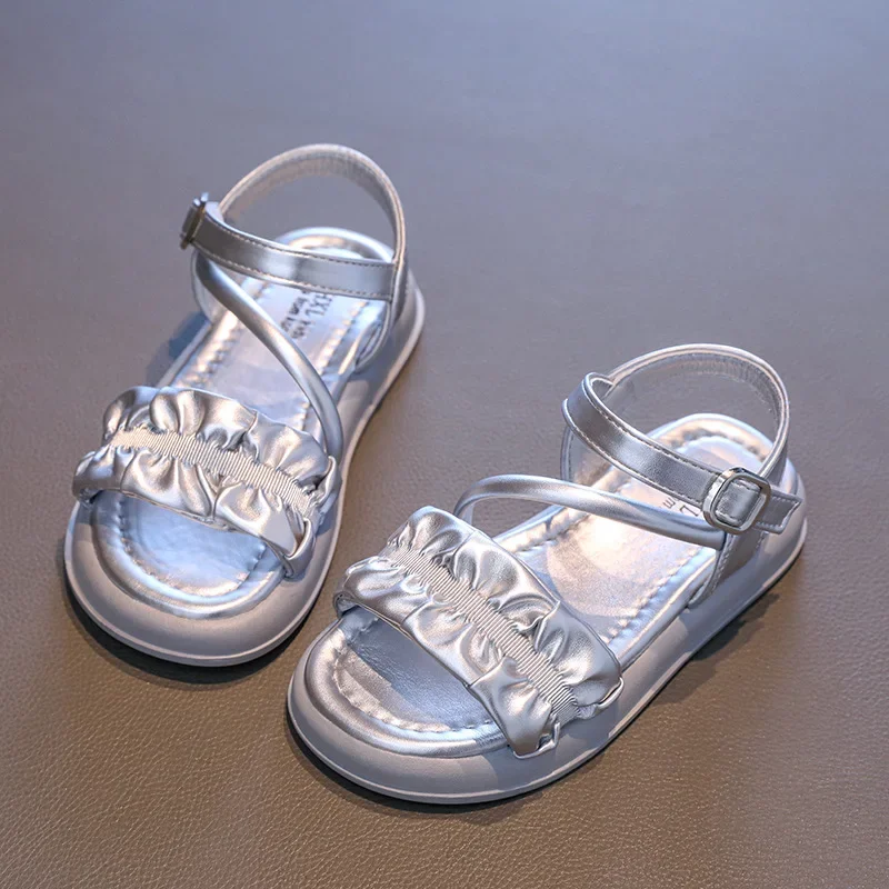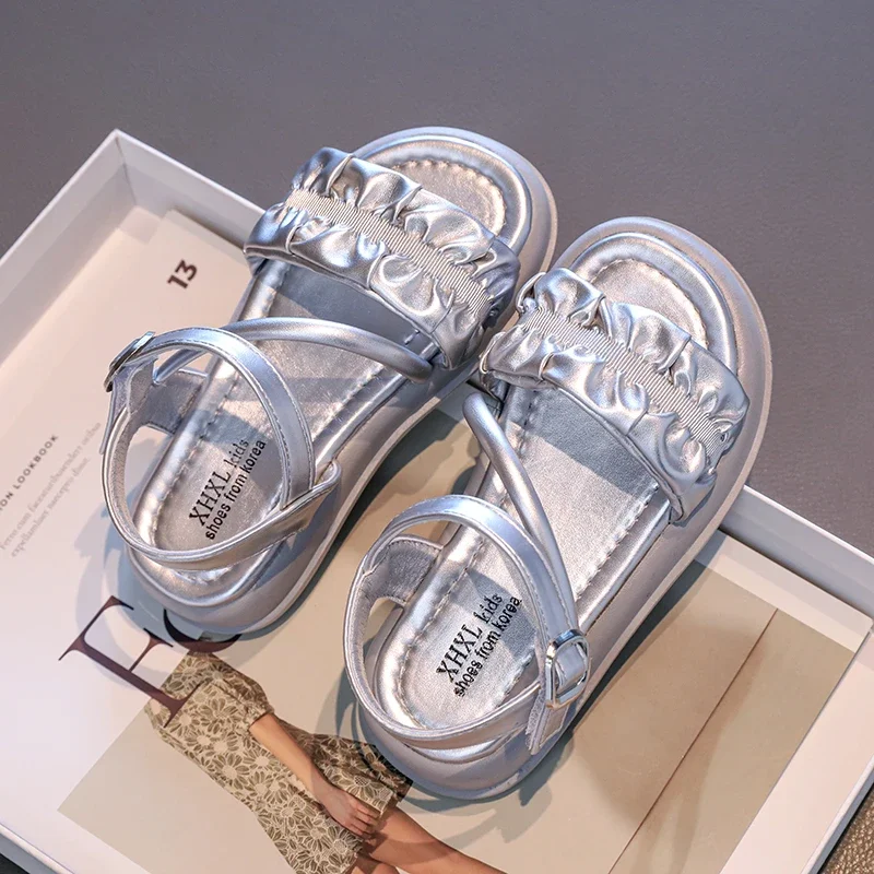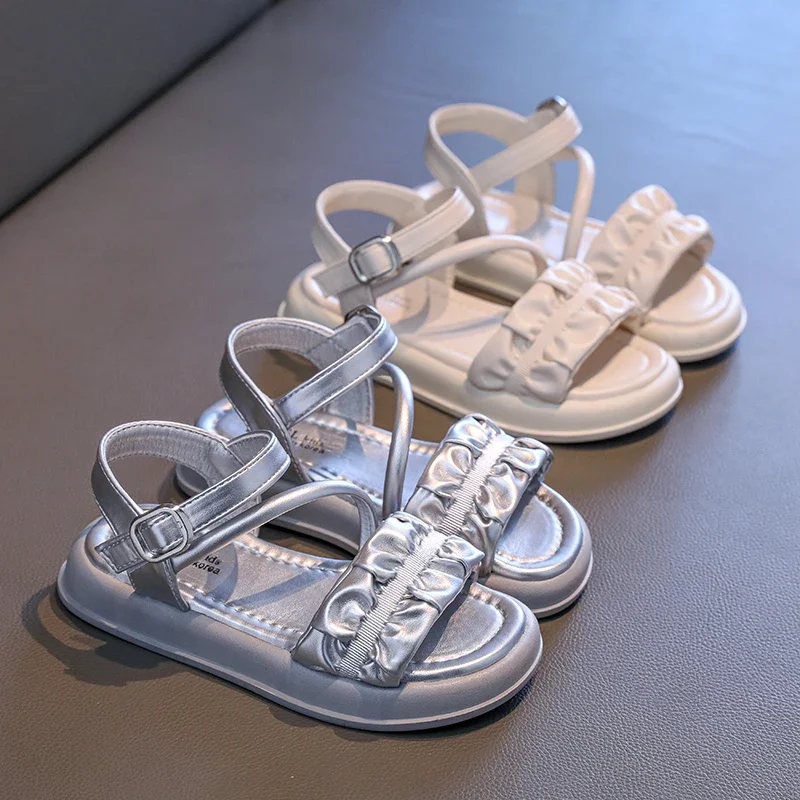 Sandales plissées simples pour enfants, sandales d'été Beige argent pour filles, sandales décontractées d'école, polyvalentes, mode gladiateur, sandales de plage pour enfants |