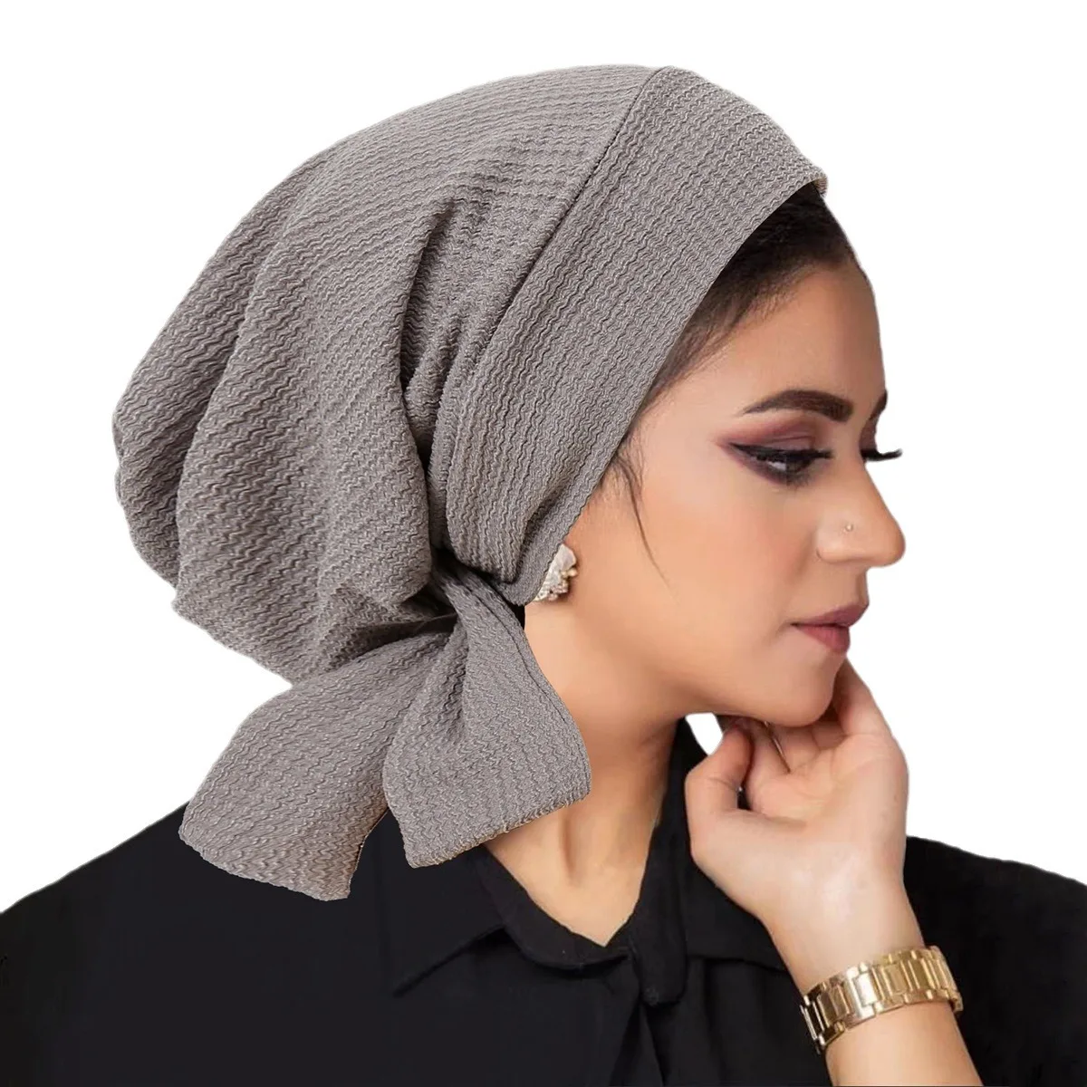 Solid Color Crinkle Turban Hijab Hats Long Tail Head Wraps Elastic Muslim Hats Breathable Chemo Cap for Women Girls