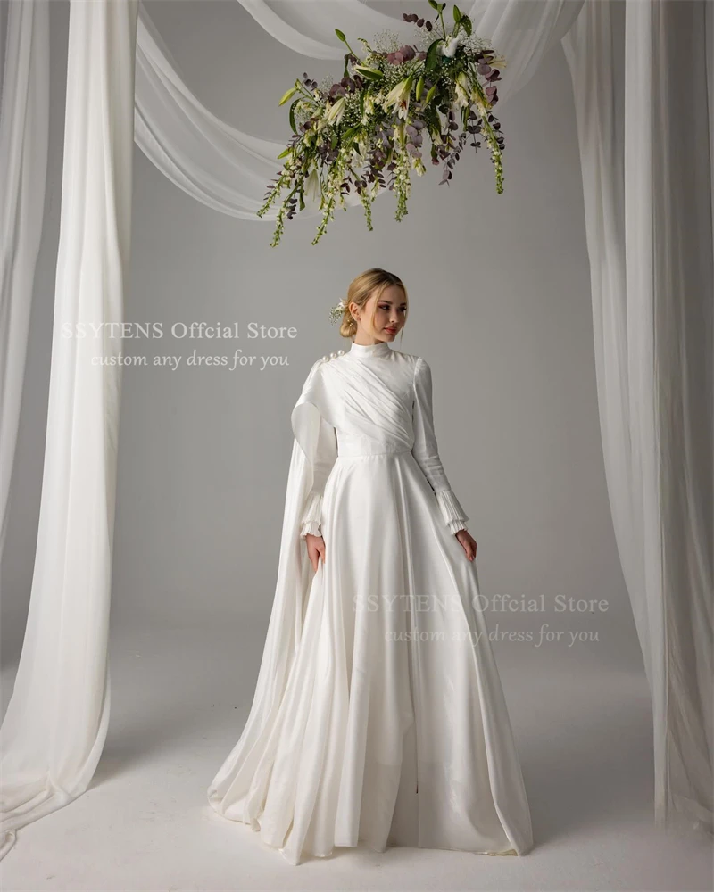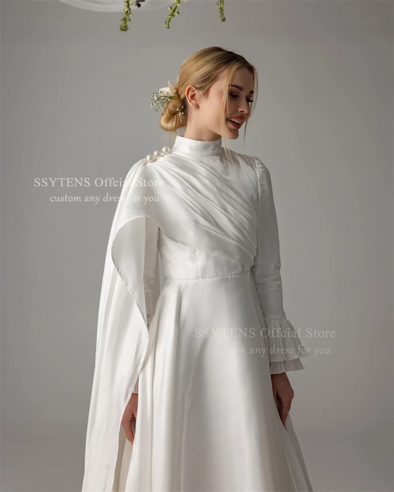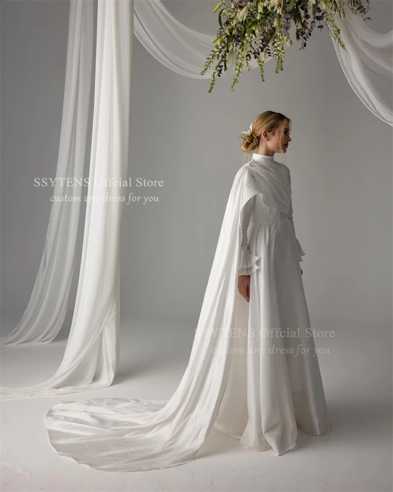 SSYTENS Robes de mariée musulmanes col haut satin perles personnalisées robes de mariée arabes avec châle manches longues Vestido De Noiva |