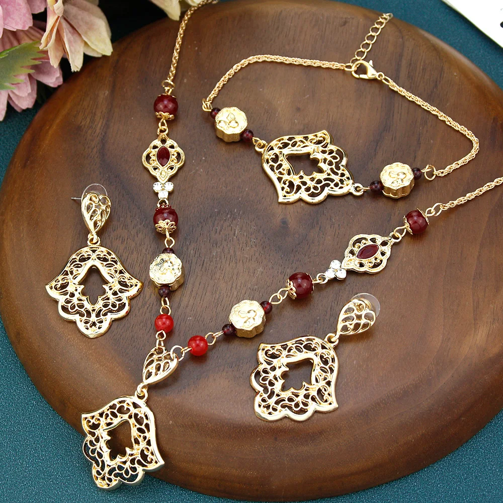"Cet ensemble de bijoux marocains est vraiment magnifique ! Les boucles d'oreilles, le collier et le bracelet ont une finition superbe et sont très élégants. Ils s'accordent parfaitement avec mes tenues de soirée. Le seul petit bémol est que le bracelet est un peu fragile, mais cela n'enlève rien au charme de ces bijoux. Je suis ravie de mon achat et je les recommande vivement !"