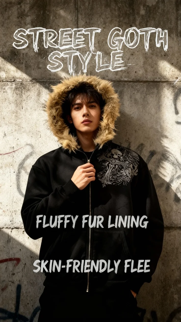Sweat à capuche gothique pour hommes et femmes, Streetwear d’hiver, noir, fermeture éclair, avec capuche en fourrure moelleuse, polaire chaude, veste surdimensionnée de Style urbain