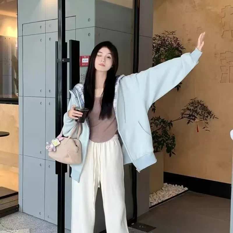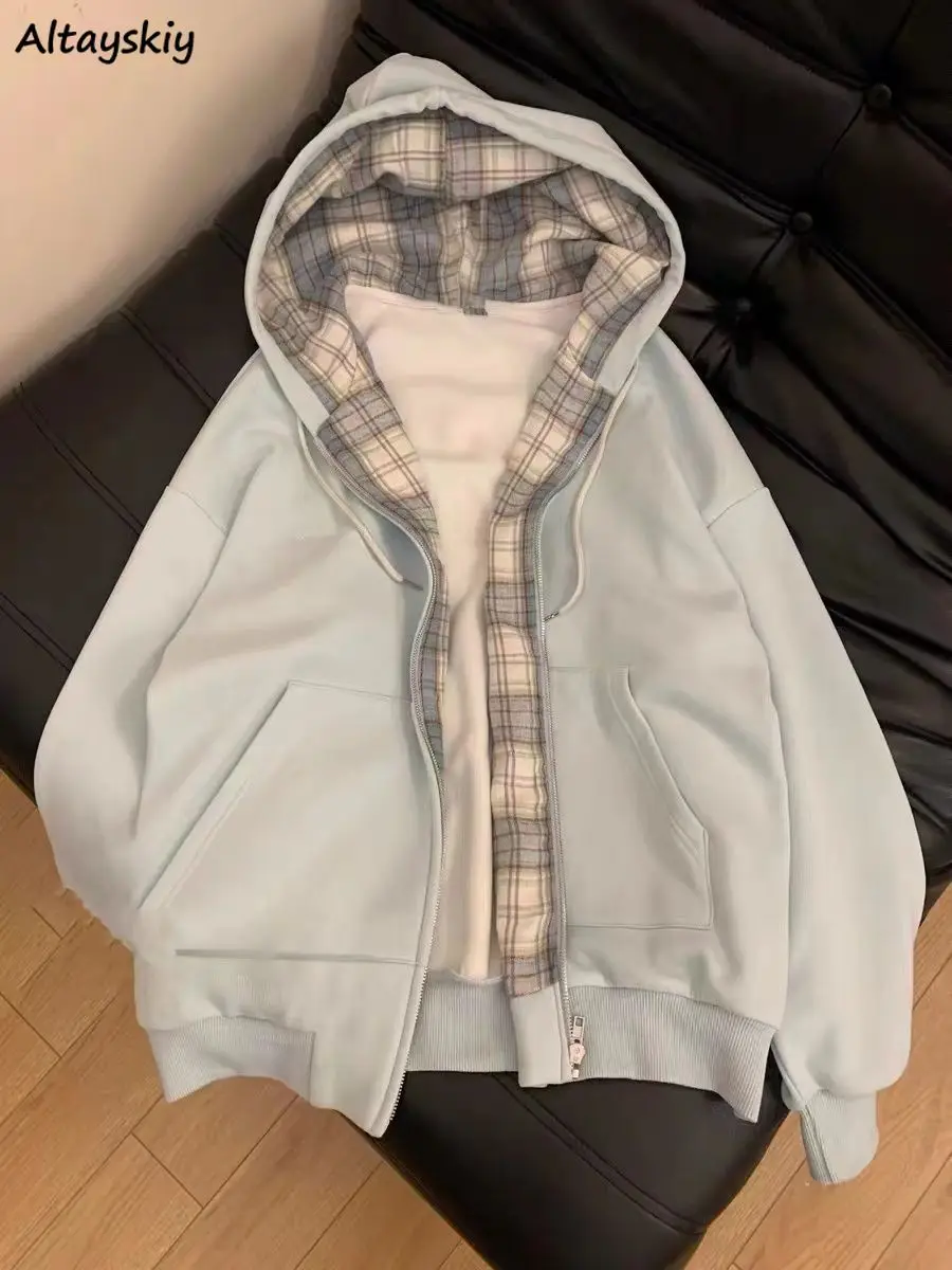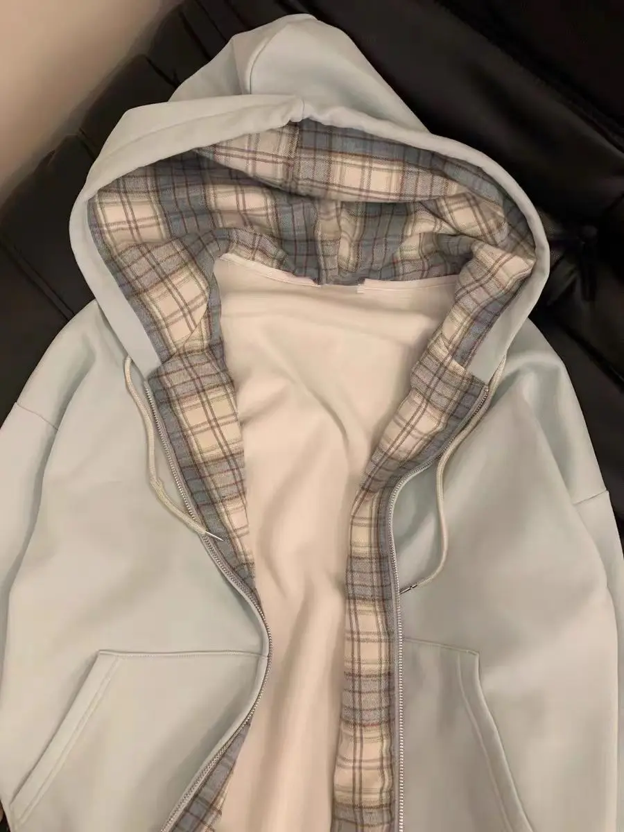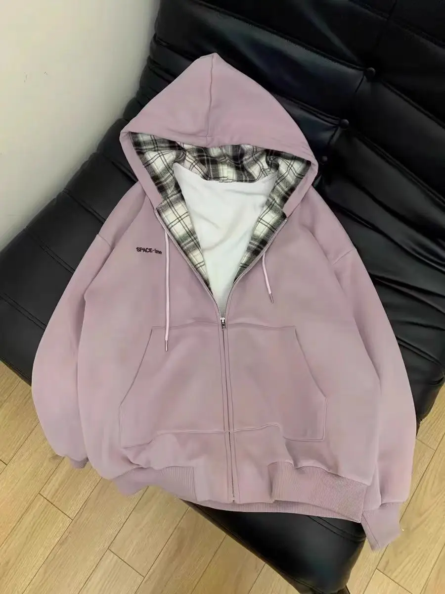 Sweats à capuche à carreaux vintage avec poches pour femmes, sweats à capuche en velours doux, températeur assressenti, haute qualité, étudiants, Ulzzang, unisexe, nouveau