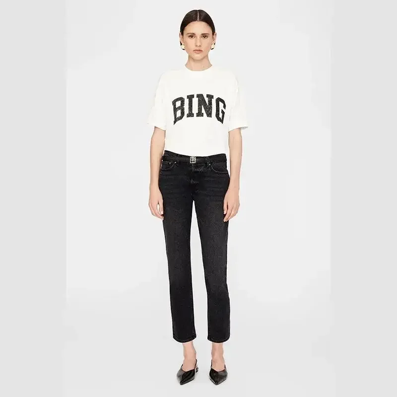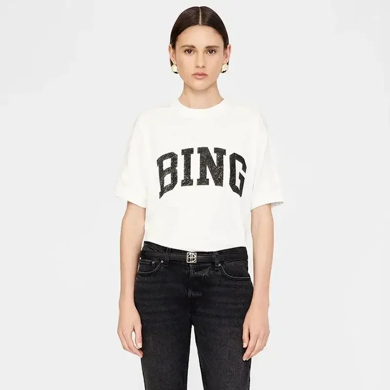 T-shirt blanc avec lettre classique AB avec impression de pointe de sable pour femme de la collection été 24