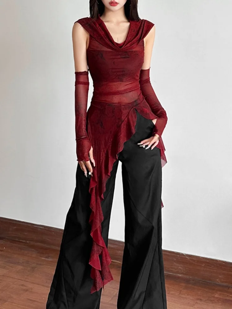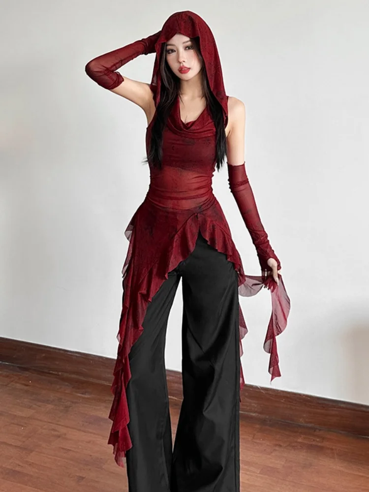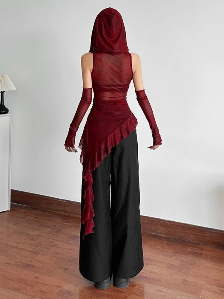 T-shirts à capuche pour femmes, Streetwear transparent en maille Y2k, couverture des manches, vêtements Grunge à volants, Camisetas gothiques