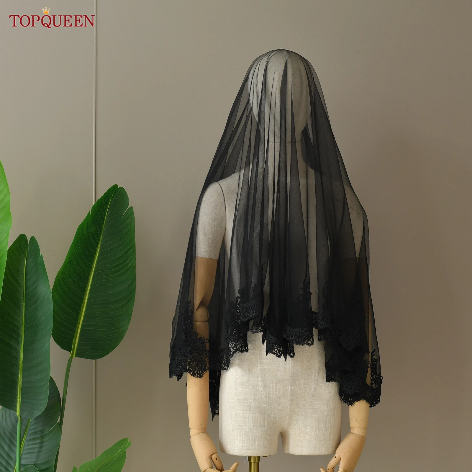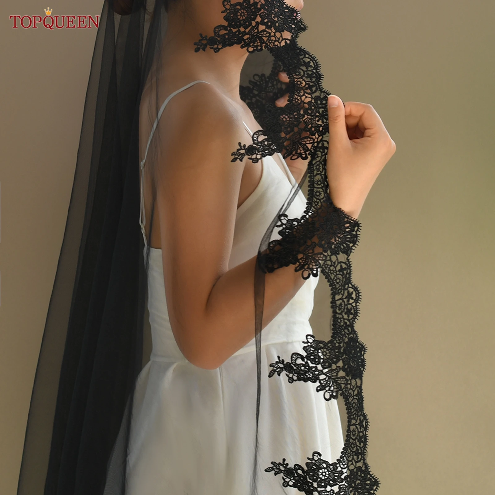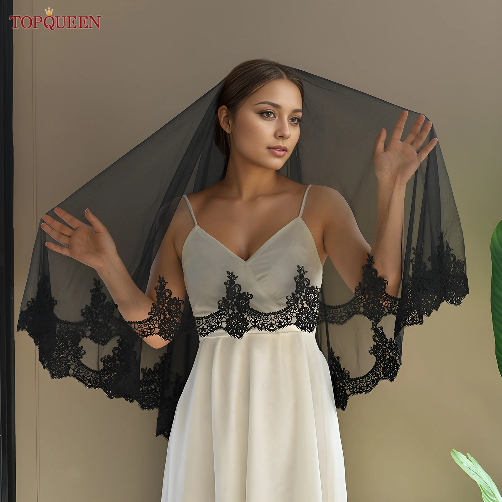 TOPQUEEN V224 voile de mariée en dentelle noire avec fard à joues bord en dentelle de haute qualité 1 couche accessoires d'halloween personnalisables |