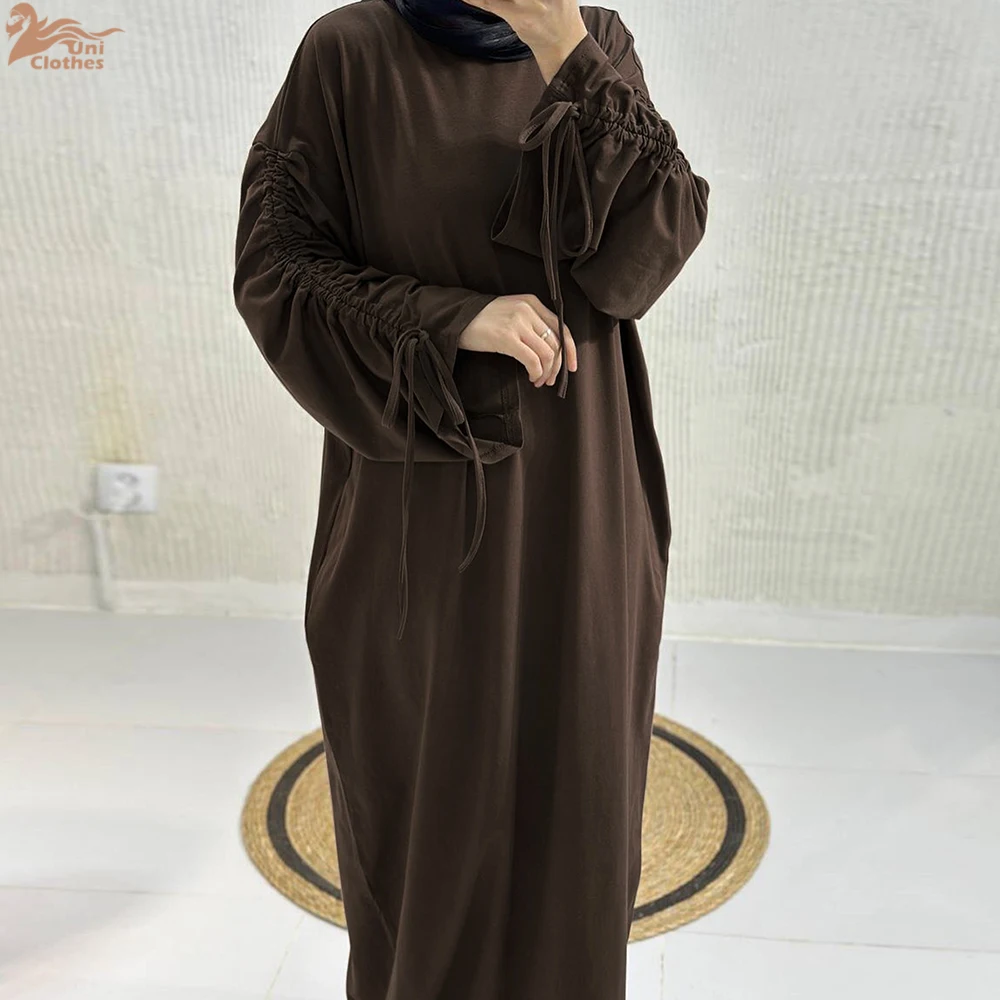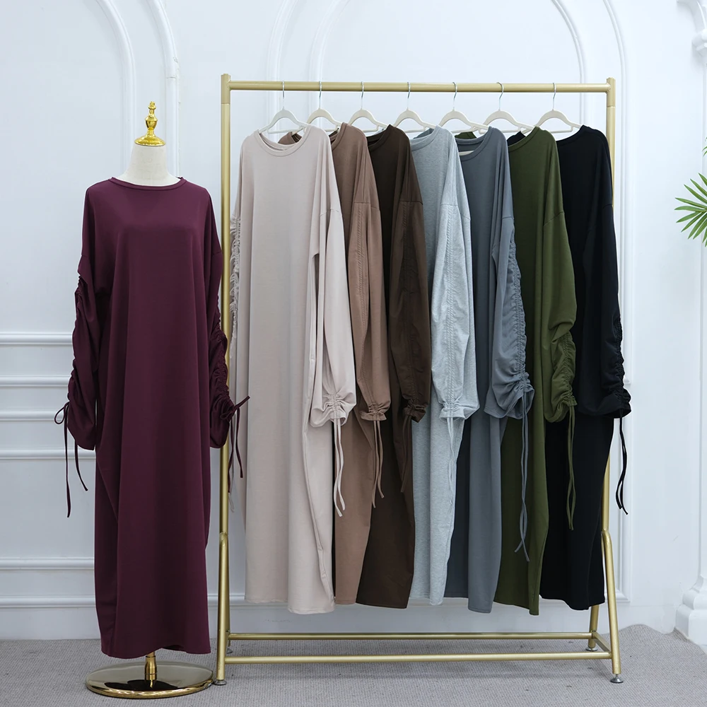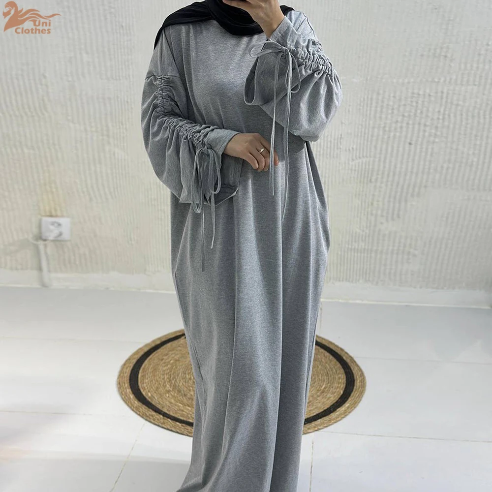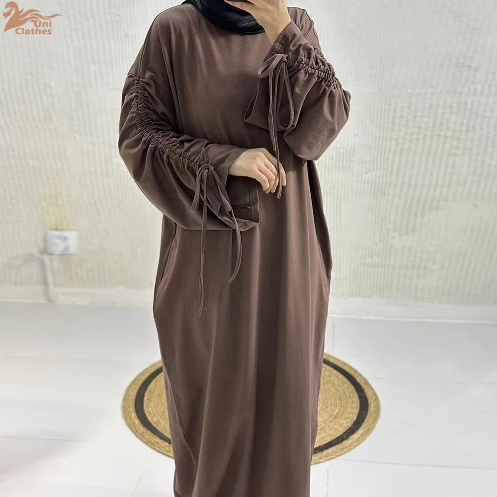 Uni nouveau Abaya 2025 islamique femmes vêtements modeste Abaya femmes robe musulmane fermé Abaya dubaï froncé cordon manches |