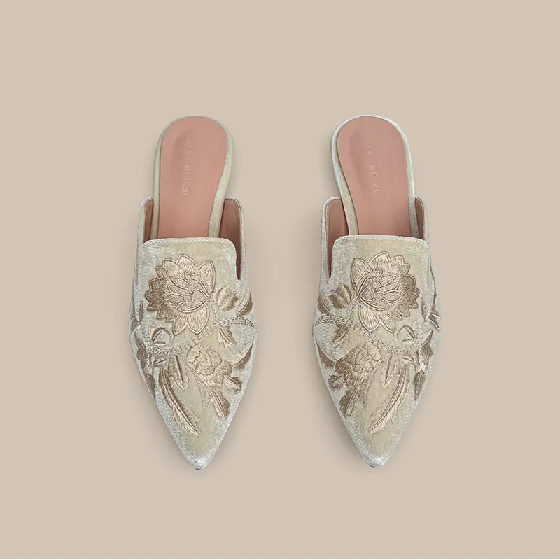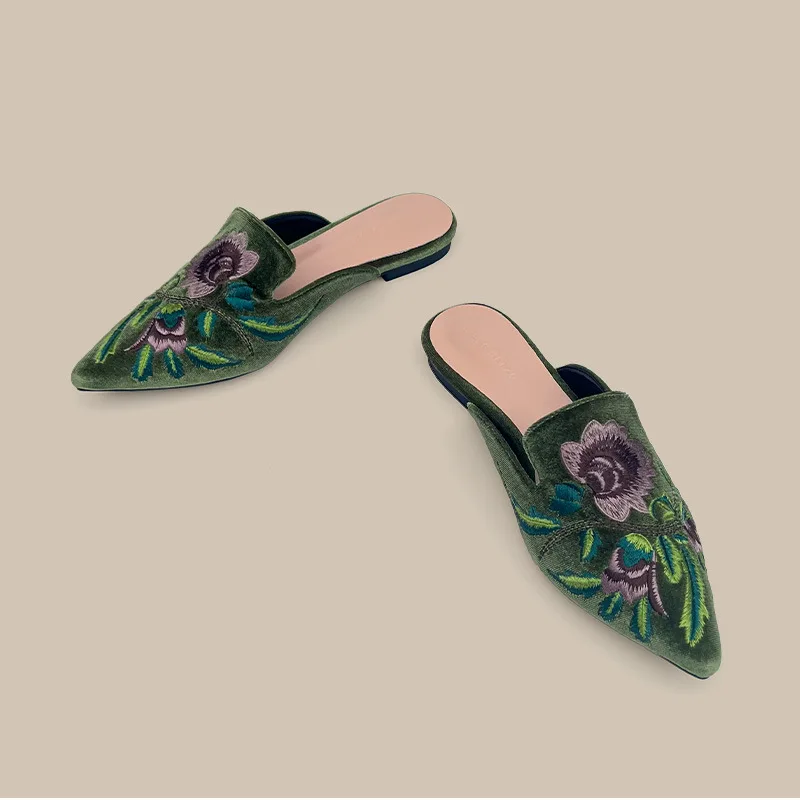 Velours broderie fleur Mules Femme chaussures élégantes pointu bout fermé pantoufles sans lacet chaussures plates diapositives Femmes Pantuflas Sandalias