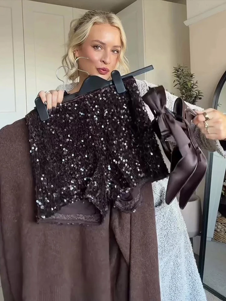 Veste courte à paillettes pour femme, ensemble à lacets, col rond, manches longues, manteaux, taille haute, Short droit, paillettes Chic, nouveaux ensembles pour femmes