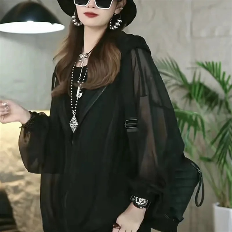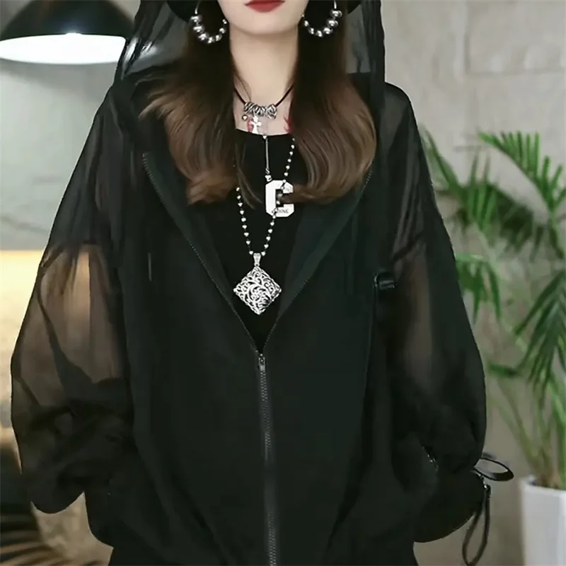 Veste d’été à capuche avec cordon de serrage pour femmes, protection solaire, nouvelle mode décontractée, couleur unie, fine et respirante, manteau de protection solaire ample