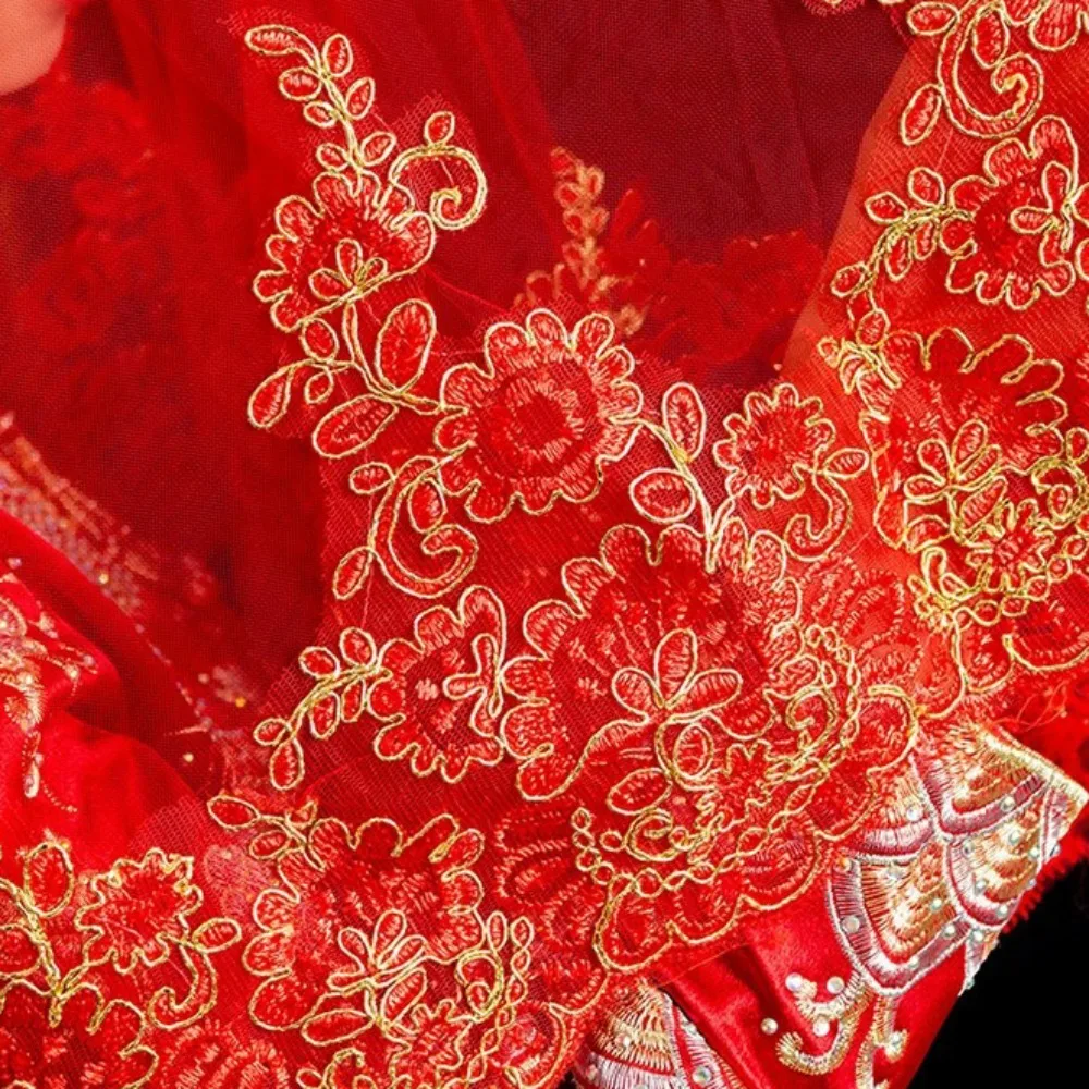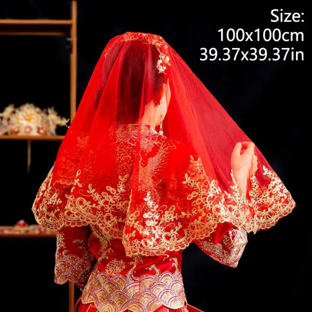Voile de mariée rouge en gaze rétro, broderie dorée, dentelle courte, couvre-tête de mariage, robe Xiuhe ancienne élégante, proposition de voile