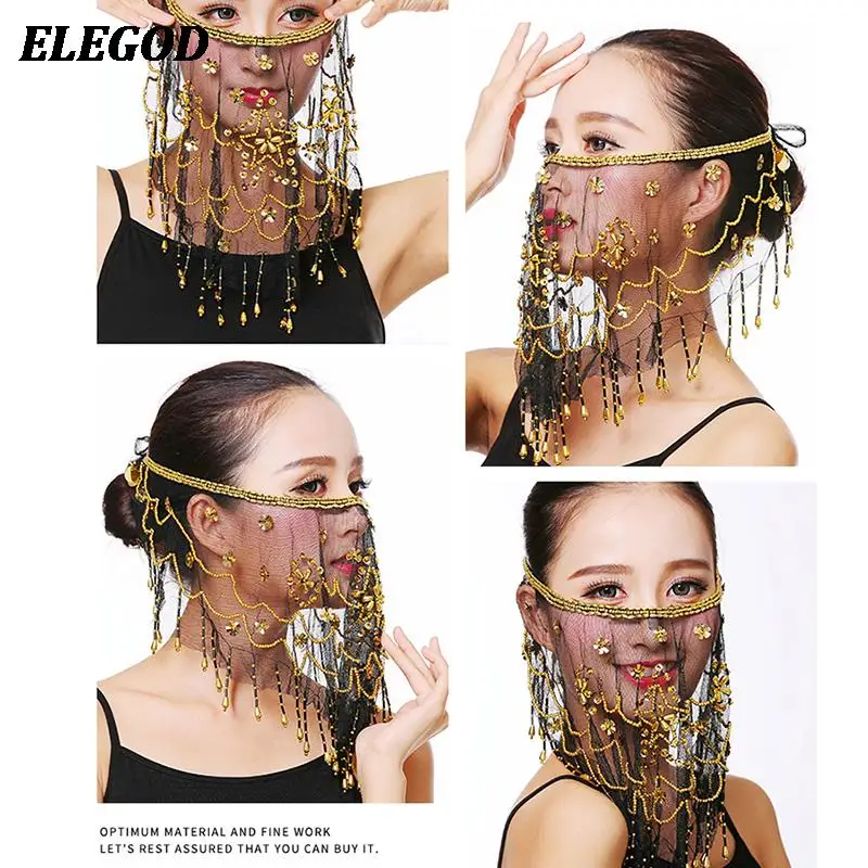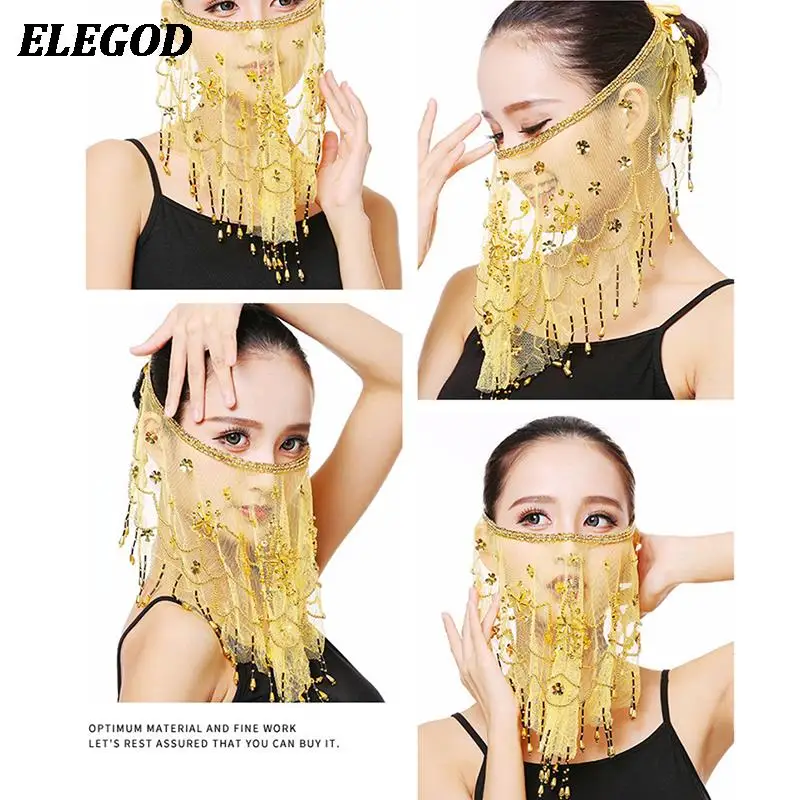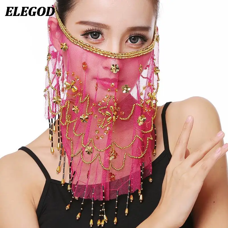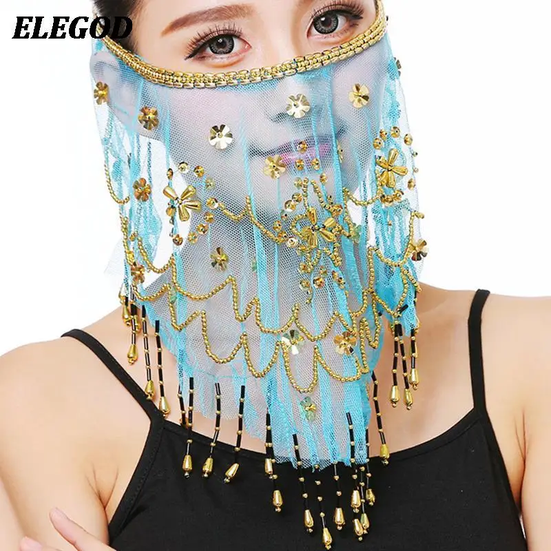 Voile facial de danse du ventre pour femmes, accessoires de costume de danse indienne, masque de mascarade Tribal à paillettes, écharpe enveloppante, masque à pompon |
