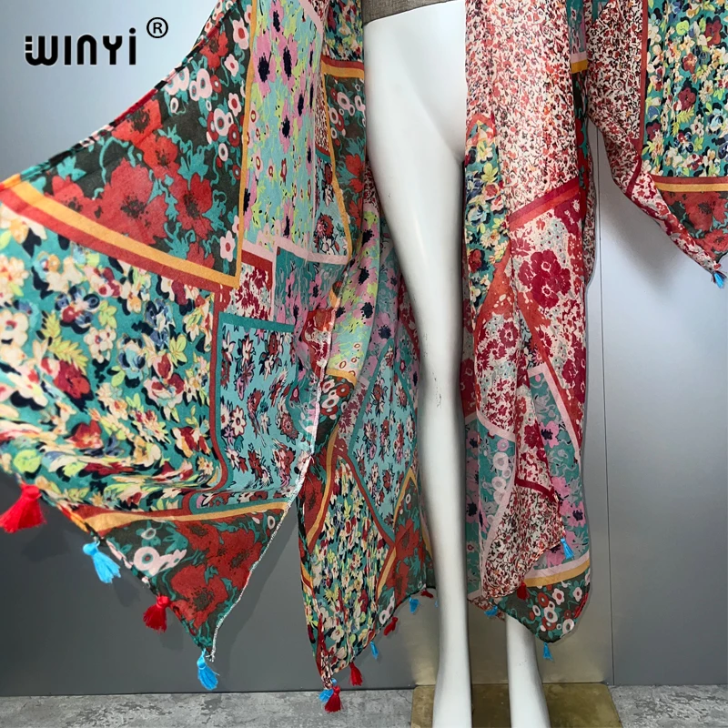 WINYI bohème kimono imprimé femmes manteau glands amples Long manteau plage vacances natation couvrir robes de soirée luxe dubaï abaya |