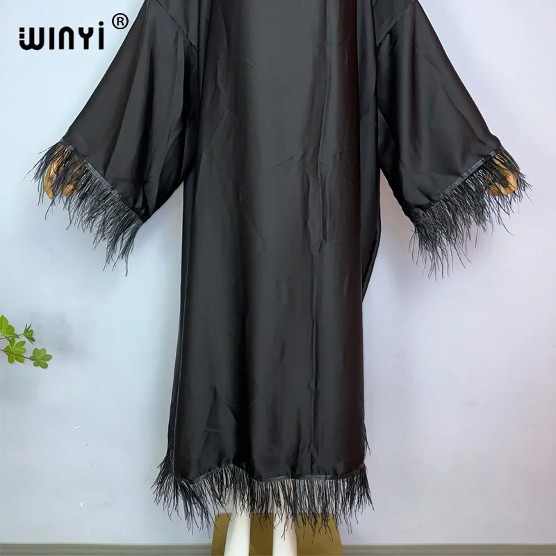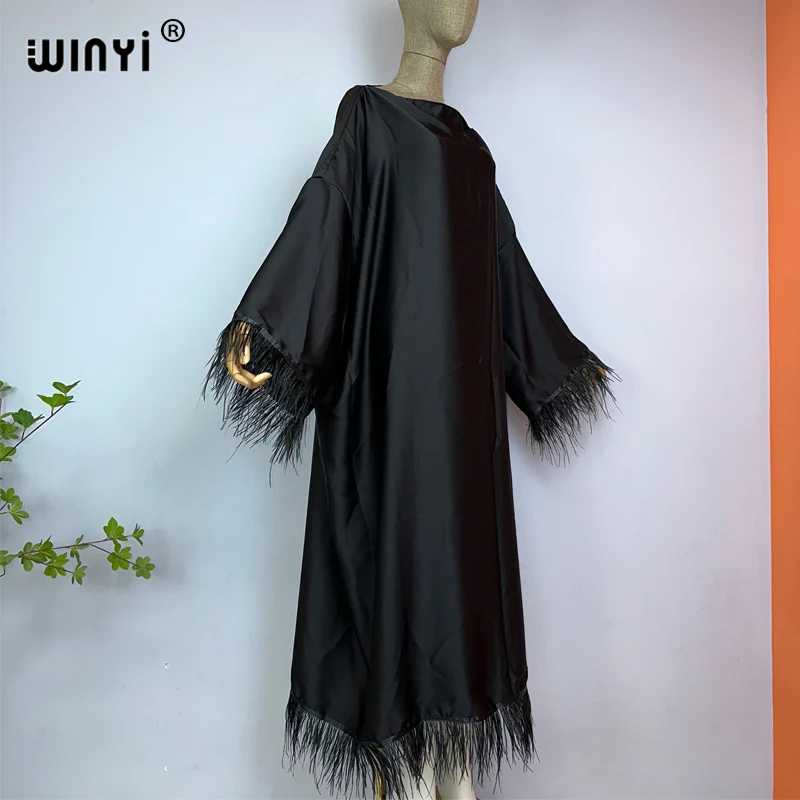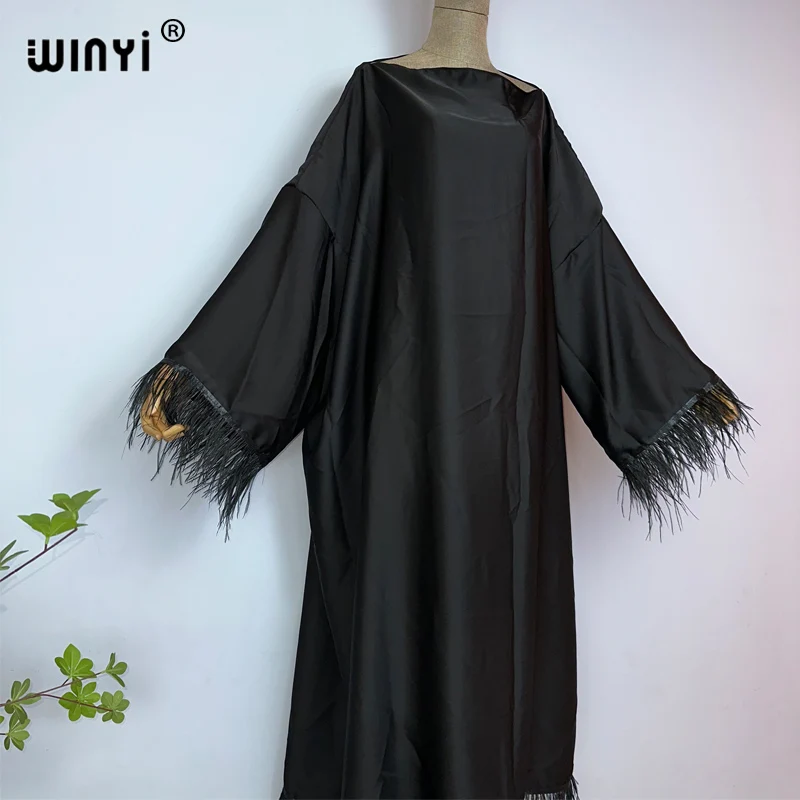 WINYI-Robe hijab noire confortable pour femmes musulmanes, robe de ramadan, kaftan, couverture complète, abaya, cheveux d’autruche, haute qualité, mode