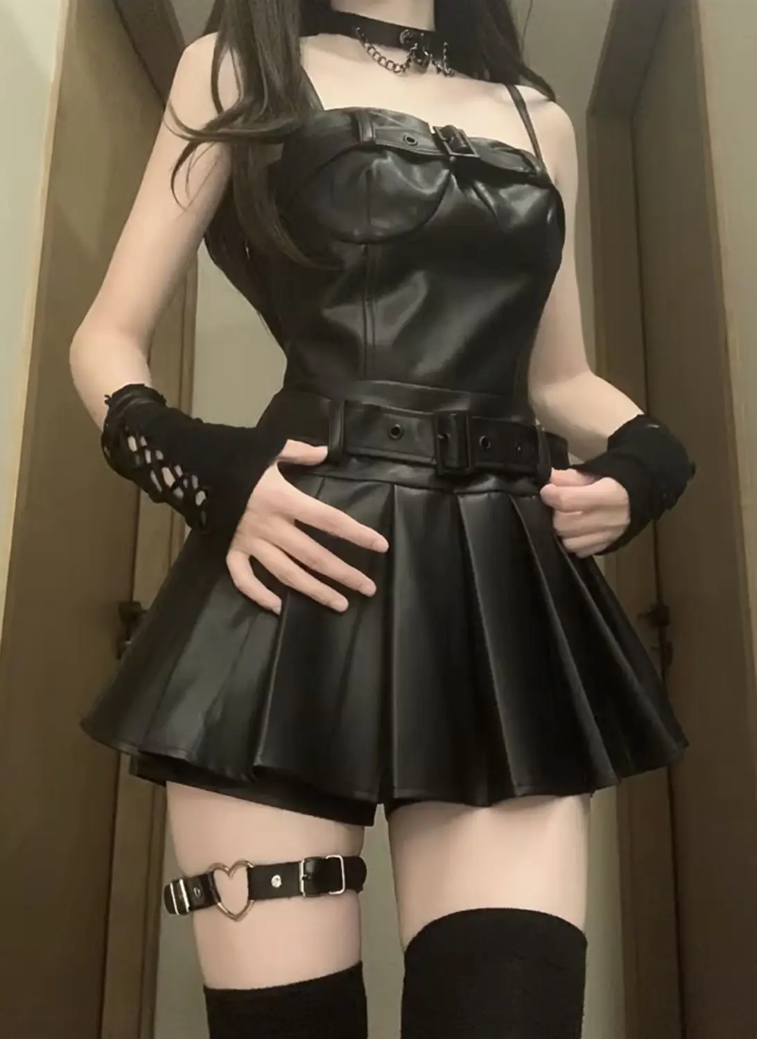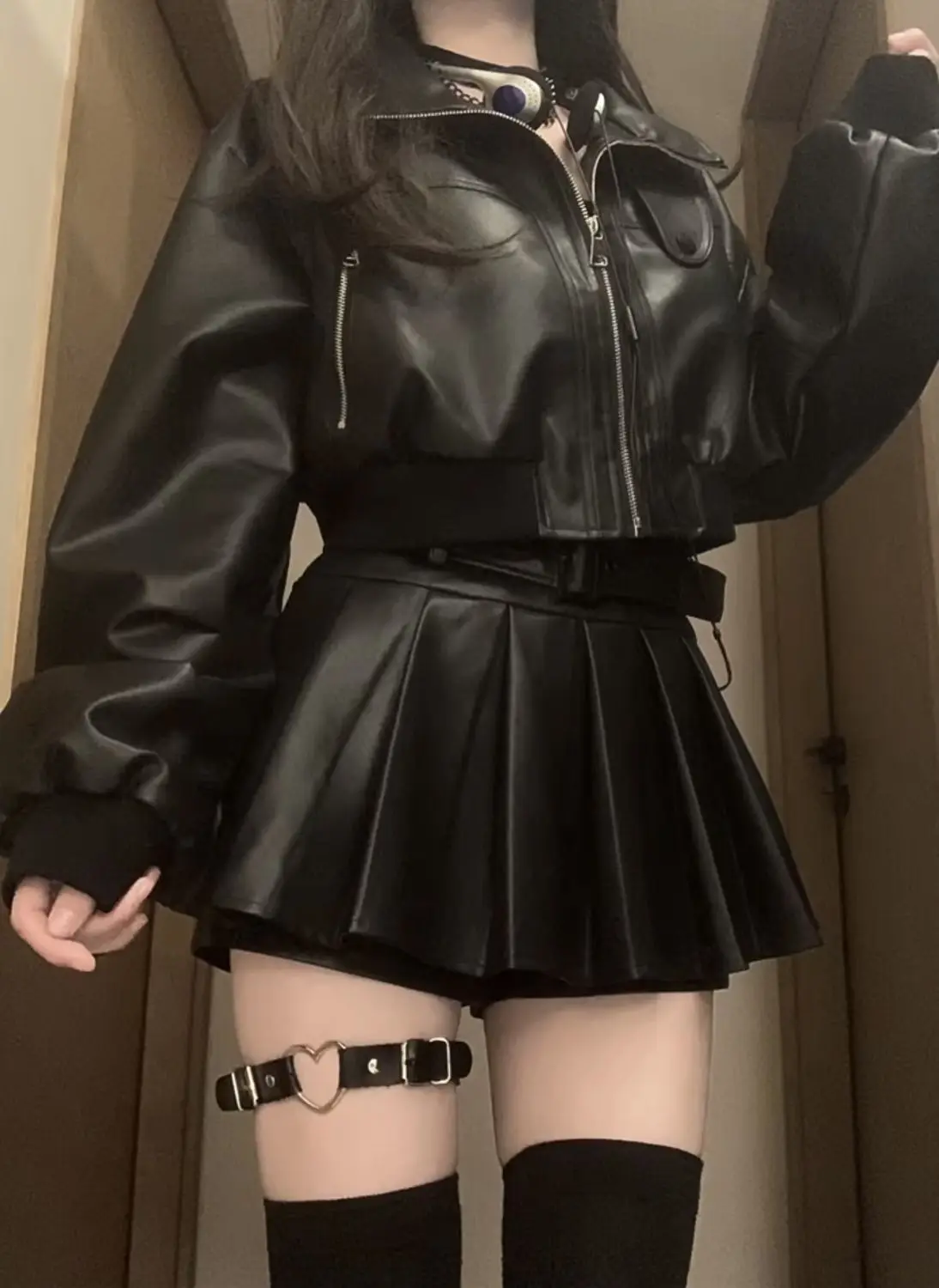 Y2K – ensemble deux pièces en cuir noir pour femmes, Harajuku Punk High Street, robe gothique Sexy pour moto, veste à fermeture éclair, jupe plisséeY2K – ensemble deux pièces en cuir noir pour femmes, Harajuku Punk High Street, robe gothique Sexy pour moto, veste à fermeture éclair, jupe plissée