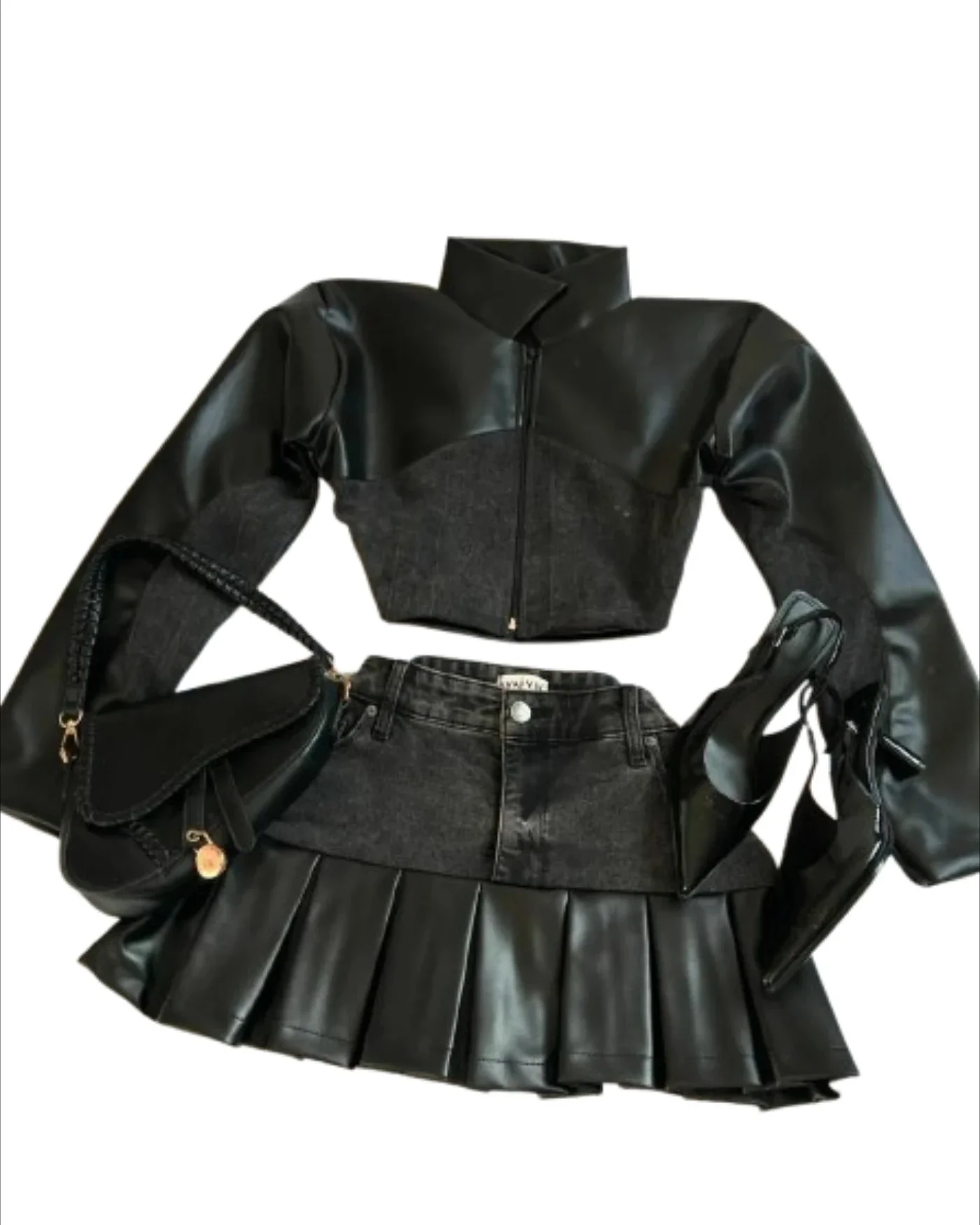 Y2K – ensemble deux pièces en Denim épissé en cuir noir pour femmes, veste à manches longues avec fermeture éclair Harajuku, nouvelle jupe plissée Sexy, costume de moto |