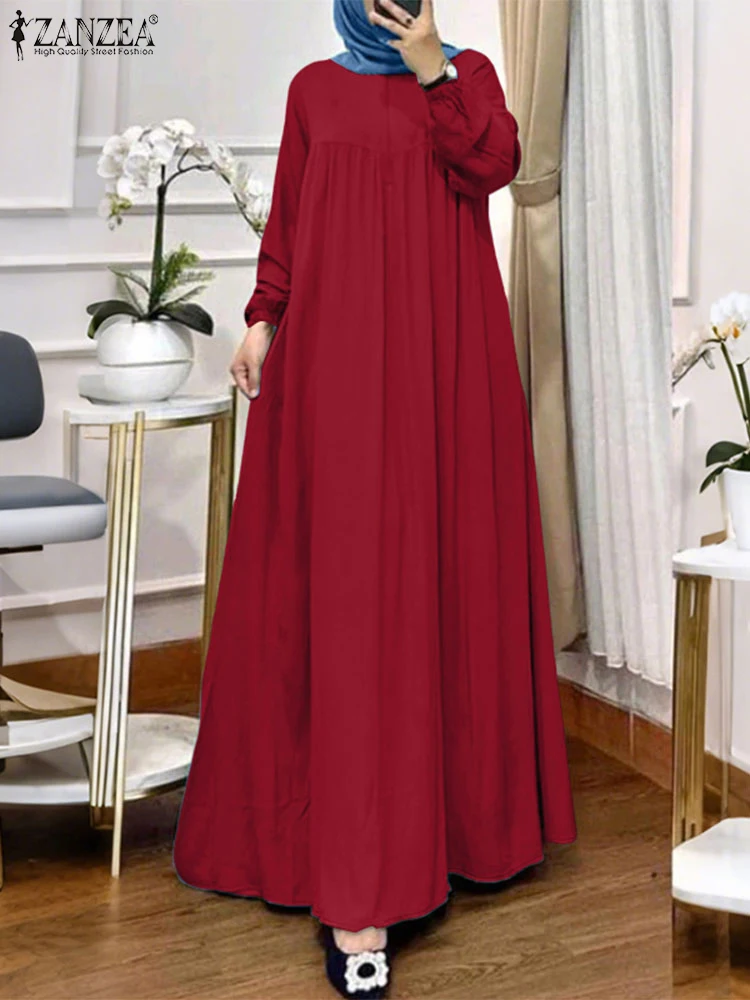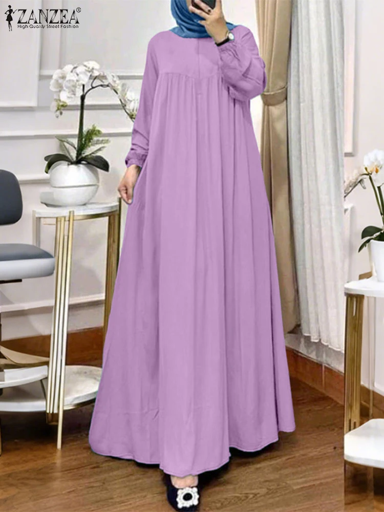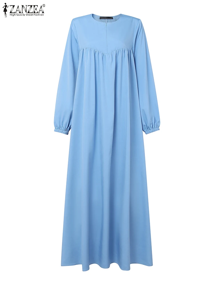 ZANZEA Muslim Womens Modest Eid Maxi Dresses Casual Loose Long Sleeve Hijab O-Neck Islamic Abaya Robes Holiday Solid Vestidos |