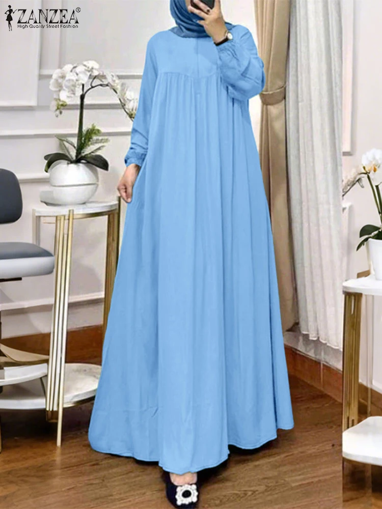 ZANZEA Muslim Womens Modest Eid Maxi Dresses Casual Loose Long Sleeve Hijab O-Neck Islamic Abaya Robes Holiday Solid Vestidos